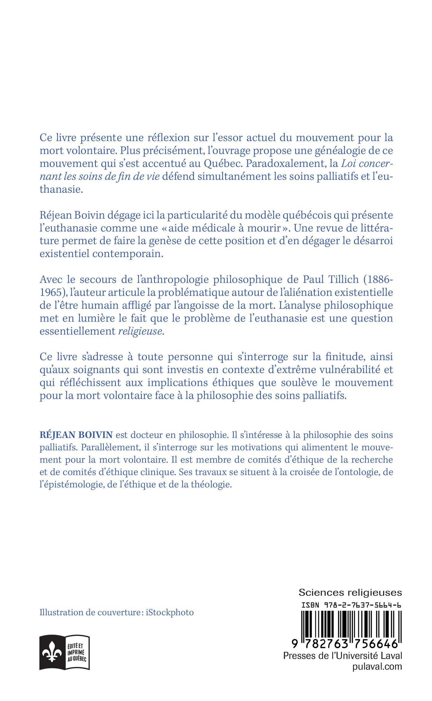 Ce livre présente une réflexion sur l’essor actuel du mouvement pour la mort volontaire. Plus précisément, l’ouvrage propose une généalogie de ce mouvement qui s’est accentué au Québec. Paradoxalement, la Loi concernant les soins de fin de vie défend simultanément les soins palliatifs et l’euthanasie. Réjean Boivin dégage ici la particularité du modèle québécois qui présente l’euthanasie comme une « aide médicale à mourir ». Une revue de littérature permet de faire la genèse de cette position et d’en dégager le désarroi existentiel contemporain.Avec le secours de l’anthropologie philosophique de Paul Tillich (1886-1965), l’auteur articule la problématique autour de l’aliénation existentielle de l’être humain affligé par l’angoisse de la mort. L’analyse philosophique met en lumière le fait que le problème de l’euthanasie est une question essentiellement religieuse.Ce livre s’adresse à toute personne qui s’interroge sur la finitude, ainsi qu’aux soignants qui sont investis en contexte d’extrême vulnérabilité et qui réfléchissent aux implications éthiques que soulève le mouvement pour la mort volontaire face à la philosophie des soins palliatifs.