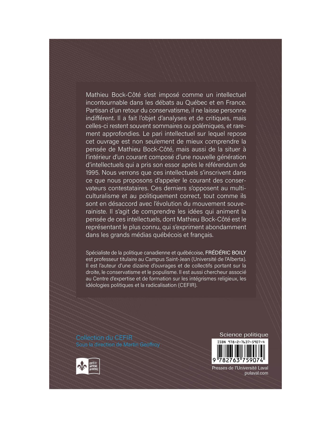 Mathieu Bock-Côté s’est imposé comme un intellectuel incontournable dans les débats au Québec et en France. Partisan d’un retour du conservatisme, il ne laisse personne indifférent. Il a fait l’objet d’analyses et de critiques, mais celles-ci restent souvent sommaires ou polémiques, et rarement approfondies. Le pari intellectuel sur lequel repose cet ouvrage est non seulement de mieux comprendre la pensée de Mathieu Bock-Côté, mais aussi de la situer à l’intérieur d’un courant composé d’une nouvelle génération d’intellectuels qui a pris son essor après le référendum de 1995. Nous verrons que ces intellectuels s’inscrivent dans ce que nous proposons d’appeler le courant des conservateurs contestataires. Ces derniers s’opposent au multiculturalisme et au politiquement correct, tout comme ils sont en désaccord avec l’évolution du mouvement souverainiste. Il s’agit de comprendre les idées qui animent la pensée de ces intellectuels, dont Mathieu Bock-Côté est le représentant le plus connu, qui s’expriment abondamment dans les grands médias québécois et français.