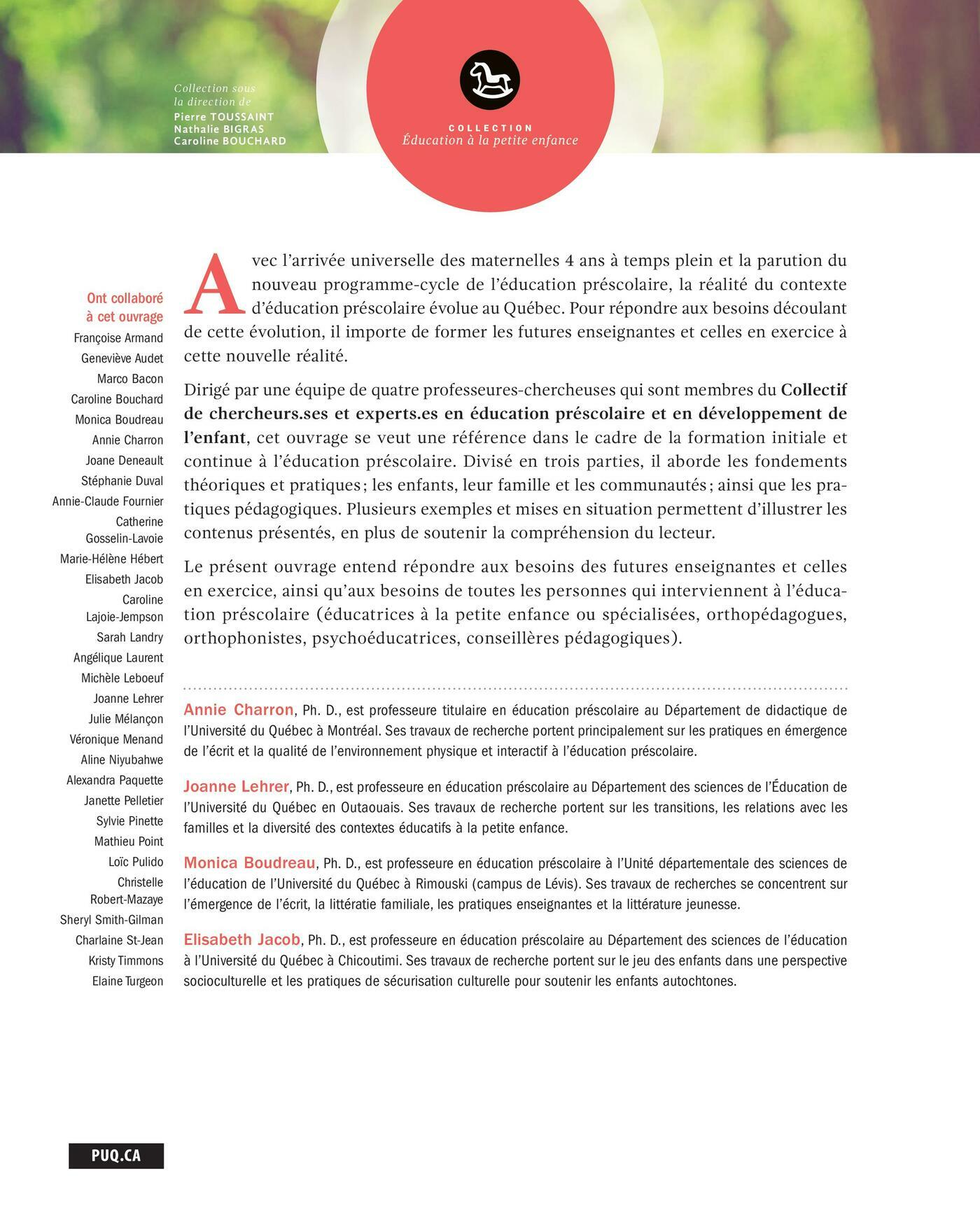 Avec l’arrivée universelle des maternelles 4 ans à temps plein et la parution du nouveau programme-cycle de l’éducation préscolaire, la réalité du contexte d’éducation préscolaire évolue au Québec. Pour répondre aux besoins découlant de cette évolution, il importe de former les futures enseignantes et celles en exercice à cette nouvelle réalité.Dirigé par une équipe de quatre professeures-chercheuses qui sont membres du Collectif de chercheurs.ses et experts.es en éducation préscolaire et en développement de l’enfant, cet ouvrage se veut une référence dans le cadre de la formation initiale et continue à l’éducation préscolaire. Divisé en trois parties, il aborde les fondements théoriques et pratiques; les enfants, leur famille et les communautés; ainsi que les pratiques pédagogiques. Plusieurs exemples et mises en situation permettent d’illustrer les contenus présentés, en plus de soutenir la compréhension du lecteur.Le présent ouvrage entend répondre aux besoins des futures enseignantes et celles en exercice, ainsi qu’à toutes les personnes qui interviennent à l’éducation préscolaire (éducatrices à la petite enfance ou spécialisées, orthopédagogues, orthophonistes, psychoéducatrices, conseillères pédagogiques).Annie Charron, Ph. D., est professeure titulaire en éducation préscolaire au Département de didactique de l’Université du Québec à Montréal. Ses travaux de recherches portent principalement sur les pratiques en émergence de l’écrit et la qualité de l’environnement physique et interactif à l’éducation préscolaire.Joanne Lehrer, Ph. D., est professeure en éducation préscolaire au Département des sciences de l’Éducation de l’Université du Québec en Outaouais. Ses travaux de recherche portent sur les transitions, les relations avec les familles, et la diversité des contextes éducatifs à la petite enfance.Monica Boudreau, Ph. D., est professeure titulaire en éducation préscolaire à l’Unité départementale des sciences de l’éducation de l’Université du Québec à Rimouski (campus de Lévis). Ses recherches se concentrent notamment sur l’émergence de l’écrit, la littératie familiale, les pratiques enseignantes et la littérature jeunesse.Elisabeth Jacob, Ph. D., est professeure en éducation préscolaire au Département des sciences de l’éducation à l’Université du Québec à Chicoutimi. Ses travaux de recherche portent sur le jeu des enfants dans une perspective socioculturelle et les pratiques de sécurisation culturelle pour soutenir les enfants autochtones.