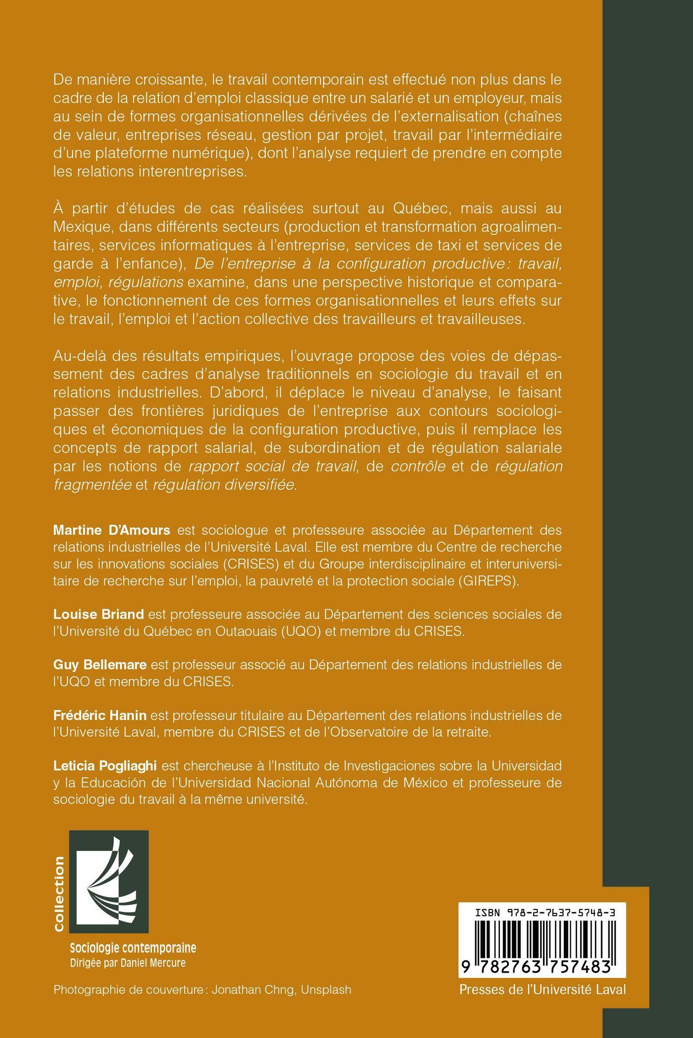 De manière croissante, le travail contemporain est effectué non plus dans le cadre de la relation d’emploi classique entre un salarié et un employeur, mais au sein de formes organisationnelles dérivées de l’externalisation (chaînes de valeur, entreprises réseau, gestion par projet, travail par l’intermédiaire d’une plateforme numérique), dont l’analyse requiert de prendre en compte les relations interentreprises. À partir d’études de cas réalisées surtout au Québec, mais aussi au Mexique, dans différents secteurs (production et transformation agroalimentaires, services informatiques à l’entreprise, services de taxi et services de garde à l’enfance), De l’entreprise à la configuration productive : travail, emploi, régulations examine, dans une perspective historique et comparative, le fonctionnement de ces formes organisationnelles et leurs effets sur le travail, l’emploi et l’action collective des travailleurs et travailleuses.Au-delà des résultats empiriques, l’ouvrage propose des voies de dépassement des cadres d’analyse traditionnels en sociologie du travail et en relations industrielles. D’abord, il déplace le niveau d’analyse, le faisant passer des frontières juridiques de l’entreprise aux contours sociologiques et économiques de la configuration productive, puis il remplace les concepts de rapport salarial, de subordination et de régulation salariale par les notions de rapport social de travail, de contrôle et de régulation fragmentée et régulation diversifiée.
