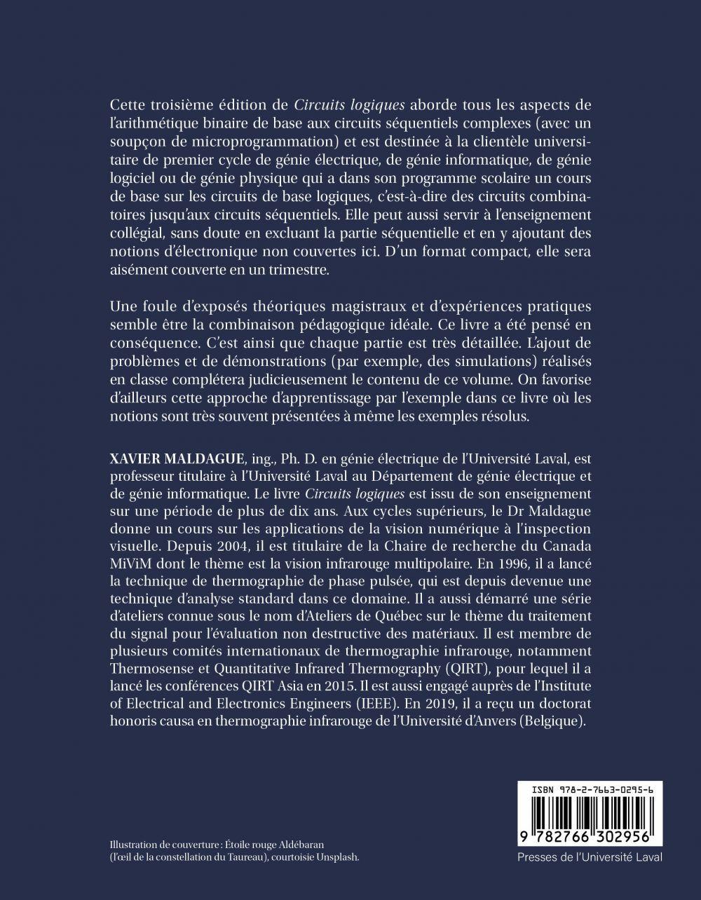 Cette troisième édition de Circuits logiques aborde tous les aspects de l’arithmétique binaire de base aux circuits séquentiels complexes (avec un soupçon de microprogrammation) et est destinée à la clientèle universitaire de premier cycle de génie électrique, de génie informatique, de génie logiciel ou de génie physique qui a dans son programme scolaire un cours de base sur les circuits de base logiques, c’est-à-dire des circuits combinatoires jusqu’aux circuits séquentiels. Elle peut aussi servir à l’enseignement collégial, sans doute en excluant la partie séquentielle et en y ajoutant des notions d’électronique non couvertes ici. D’un format compact, elle sera aisément couverte en un trimestre.Une foule d’exposés théoriques magistraux et d’expériences pratiques semble être la combinaison pédagogique idéale. Ce livre a été pensé en conséquence. C’est ainsi que chaque partie est très détaillée. L’ajout de problèmes et de démonstrations (par exemple, des simulations) réalisés en classe complétera judicieusement le contenu de ce volume. On favorise d’ailleurs cette approche d’apprentissage par l’exemple dans ce livre où les notions sont très souvent présentées à même les exemples résolus.
