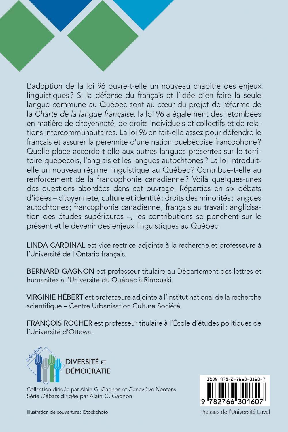 L’adoption de la loi 96 ouvre-t-elle un nouveau chapitre des enjeux linguistiques ? Si la défense du français et l’idée d’en faire la seule langue commune au Québec sont au cœur du projet de réforme de la Charte de la langue française, la loi 96 a également des retombées en matière de citoyenneté, de droits individuels et collectifs et de relations intercommunautaires. La loi 96 en fait-elle assez pour défendre le français et assurer la pérennité d’une nation québécoise francophone ? Quelle place accorde-t-elle aux autres langues présentes sur le territoire québécois, l’anglais et les langues autochtones ? La loi introduit-elle un nouveau régime linguistique au Québec ? Contribue-t-elle au renforcement de la francophonie canadienne ? Voilà quelques-unes des questions abordées dans cet ouvrage. Réparties en six débats d’idées – citoyenneté, culture et identité ; droits des minorités ; langues autochtones ; francophonie canadienne ; français au travail ; anglicisation des études supérieures –, les contributions se penchent sur le présent et le devenir des débats linguistiques au Québec.
