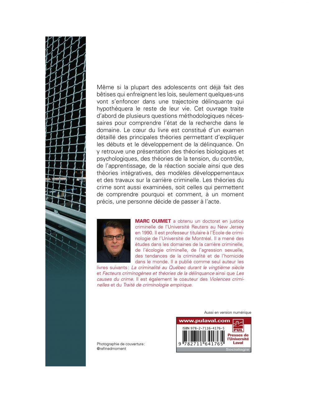 Même si la plupart des adolescents ont déjà fait des bêtises qui enfreignent les lois, seulement quelques-uns vont s'enfoncer dans une trajectoire délinquante qui hypothéquera le reste de leur vie. Cet ouvrage traite d'abord de plusieurs questions méthodologiques nécessaires pour comprendre l'état de la recherche dans le domaine. Le cœur du livre est constitué d'un examen détaillé des principales théories permettant d'expliquer les débuts et le développement de la délinquance. On y retrouve une présentation des théories biologiques et psychologiques, des théories de la tension, du contrôle, de l'apprentissage, de la réaction sociale ainsi que des théories intégratives, des modèles développementaux et des travaux sur la carrière criminelle. Les théories du crime sont aussi examinées, soit celles qui permettent de comprendre pourquoi et comment, à un moment précis, une personne décide de passer à l'acte.