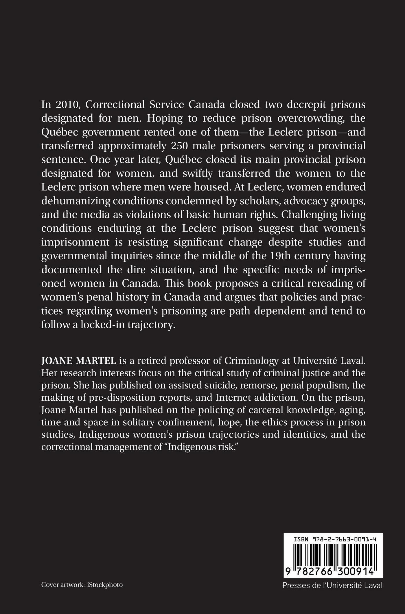 In 2010, Correctional Service Canada closed two decrepit prisons designated for men. Hoping to reduce prison overcrowding, the Québec government rented one of them—the Leclerc prison—and transferred approximately 250 male prisoners serving a provincial sentence. One year later, Québec closed its main provincial prison designated for women, and swiftly transferred the women to the Leclerc prison where men were housed. At Leclerc, women endured dehumanizing conditions condemned by scholars, advocacy groups, and the media as violations of basic human rights. Challenging living conditions enduring at the Leclerc prison suggest that women’s imprisonment is resisting significant change despite studies and governmental inquiries since the middle of the 19th century having documented the dire situation, and the specific needs of imprisoned women in Canada. This book proposes a critical rereading of women’s penal history in Canada and argues that policies and practices regarding women’s prisoning are path dependent and tend to follow a locked-in trajectory.