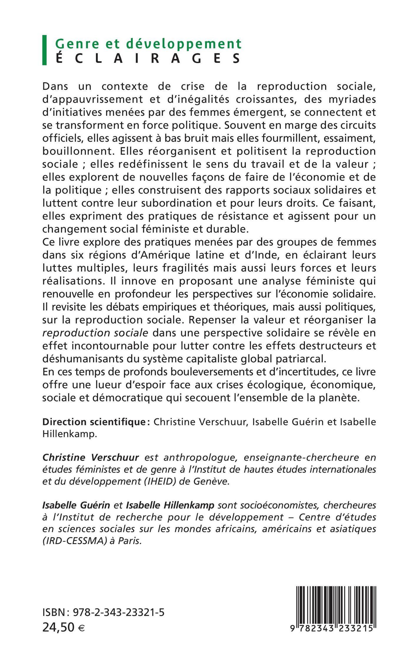 Dans un contexte de crise de la reproduction sociale, d'appauvrissement et d’inégalités croissantes, des myriades d'initiatives menées par des femmes émergent, se connectent et se transforment en force politique. Souvent en marge des circuits officiels, elles agissent à bas bruit mais elles fourmillent, essaiment, bouillonnent. Elles réorganisent et politisent la reproduction sociale, elles redéfinissent le sens du travail et de la valeur, elles explorent de nouvelles façons de faire de l'économie et de la politique, elles construisent des rapports sociaux solidaires et luttent contre leur subordination et pour leurs droits. Ce faisant, elles expriment des pratiques de résistance et agissent pour un changement social féministeet durable. Ce livre explore des pratiques menées par des groupes de femmes dans six régionsd’Amérique latine et d’Inde, en éclairant leurs luttes multiples, leurs fragilités mais aussi leurs forces et leurs réalisations. Il innove en proposant une analyse féministe qui renouvelle en profondeur les perspectives sur l’économie solidaire. Il revisite les débats empiriques et théoriques, mais aussi politiques, sur la reproduction sociale. Repenser la valeur et réorganiser la reproduction sociale dans une perspective solidaire se révèle en effet incontournable pour lutter contre les effets destructeurs et déshumanisants du système capitaliste global patriarcal. En ces temps de profonds bouleversements et d’incertitudes, ce livre offre une lueur d'espoir face aux crises écologique, économique, sociale et démocratique qui secouent l’ensemble de la planète.