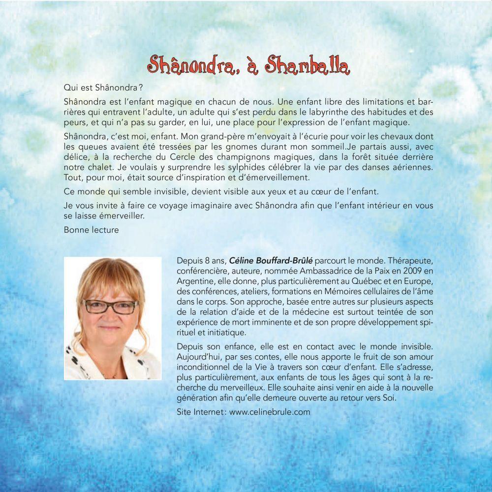 Qui est Shânondra?Shânondra est l’enfant en chacun de nous. Un enfant libre des limitations et barrières qui entravent l’adulte, un adulte qui s’est perdu dans le labyrinthe des habitudes et des peurs, et qui n’a pas su garder, en lui, une place pour l’expression de l’enfant magique.Shânondra, c’est moi, enfant. Mon grand-père m’envoyait à l’écurie pour voir les chevaux dont les queues avaient été tressées par les gnomes durant mon sommeil. Je partais aussi, avec délice, à la recherche du Cercle des champignons magiques, dans la forêt située derrière notre chalet. Je voulais y surprendre les sylphides célébrer la vie par des danses aériennes. Tout pour moi, était source d’inspiration et d’émerveillement.Ce monde qui semble invisible, devient visible aux yeux et au cœur de l’enfant.Je vous invite à faire ce voyage imaginaire avec Shânondra, afin que l’enfant intérieur en vous se laisse émerveiller.Bonne lecture.