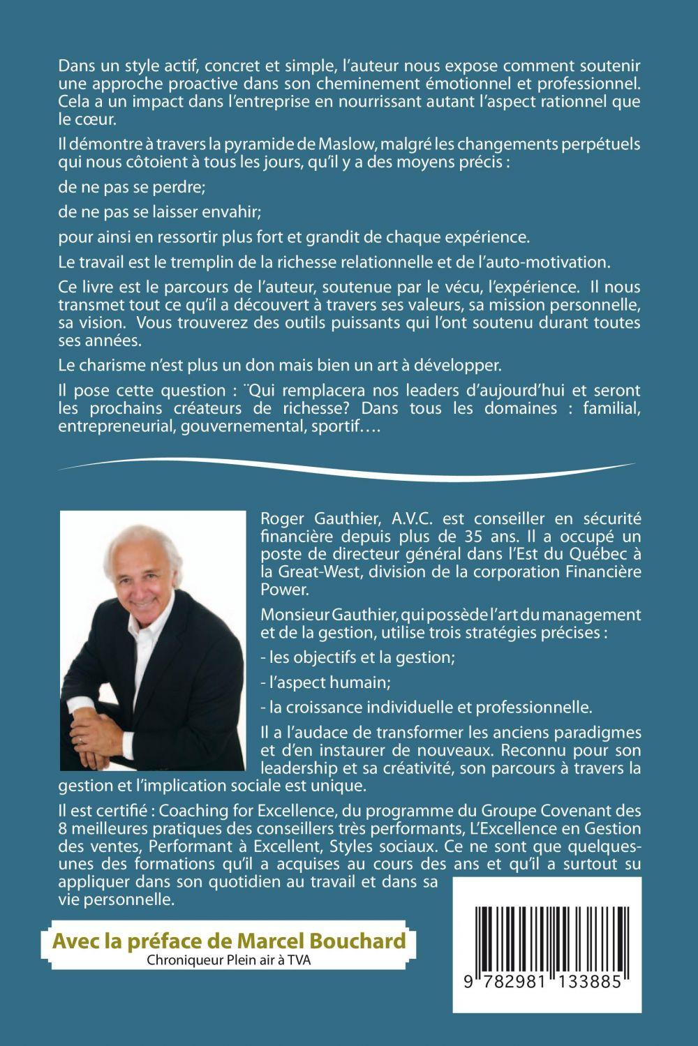Dans un style actif, concret et simple, l'auteur nous expose comment soutenir une approche proactive dans notre cheminement émotionnel et professionnel. Cela a un impact dans l'entreprise en nourrissant autant l'aspect rationnel que le cœur. Il démontre à travers la pyramide de Maslow, malgré les changements perpétuels qui nous côtoient à tous les jours, qu'il y a des moyens précis :- de ne pas se perdre ;- de ne pas se laisser envahir ;pour ainsi en ressortir plus fort et grandi de chaque expérience. Le travail est le tremplin de la richesse relationnelle et de l'auto-motivation. Ce livre est le parcours de l'auteur, soutenu par le vécu, l'expérience. Il nous transmet tout ce qu'il a découvert à travers ses valeurs, sa mission personnelle, sa vision. Vous trouverez des outils puissants qui l'ont soutenu durant toutes ces années. Le charisme n'est plus un don mais bien un art à développer. Il pose cette question : Qui remplacera nos leaders d'aujourd'hui et seront les prochains créateurs de richesse ? Dans tous les domaines : familial, entrepreneurial, gouvernemental, sportif...