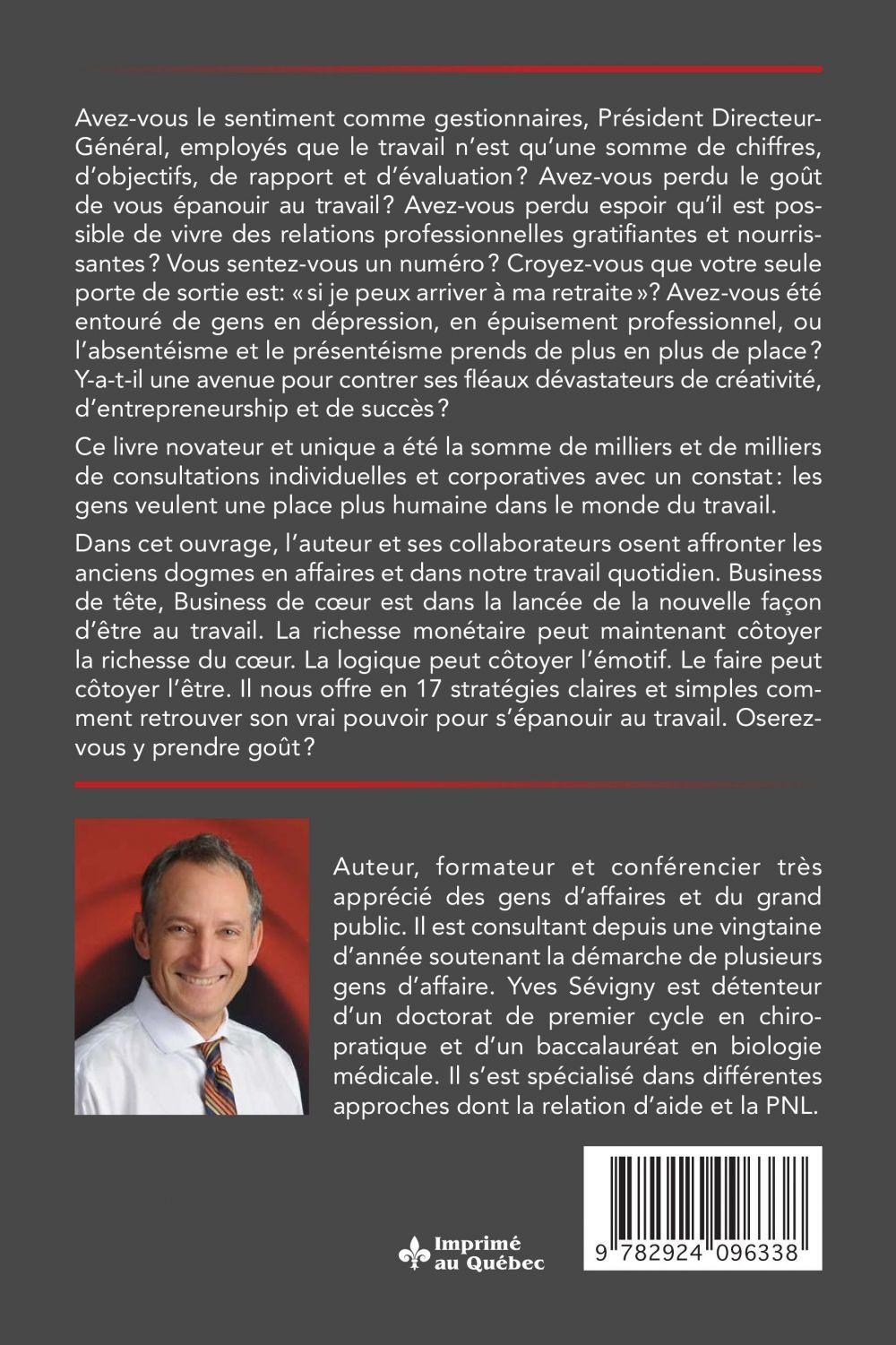 Avez-vous le sentiment comme gestionnaires, Président Directeur-Général, employés que le travail n’est qu’une somme de chiffres, d’objectifs, de rapport et d’évaluation? Avez-vous perdu le goût de vous épanouir au travail? Avez-vous perdu espoir qu’il est possible de vivre des relations professionnelles gratifiantes et nourrissantes? Vous sentez-vous un numéro? Croyez-vous que votre seule porte de sortie est: «si je peux arriver à ma retraite»? Avez-vous été entouré de gens en dépression, en épuisement professionnel, ou l’absentéisme et le présentéisme prends de plus en plus de place?? Y-a-t-il une avenue pour contrer ses fléaux dévastateurs de créativité, d’entrepreneurship et de succès? Ce livre novateur et unique a été la somme de milliers et de milliers de consultations individuelles et corporatives avec un constat: les gens veulent une place plus humaine dans le monde du travail.Dans cet ouvrage, l’auteur et ses collaborateurs osent affronter les anciens dogmes en affaires et dans notre travail quotidien. Business de tête, Business de cœur est dans la lancée de la nouvelle façon d’être au travail. La richesse monétaire peut maintenant côtoyer la richesse du cœur. La logique peut côtoyer l’émotif. Le faire peut côtoyer l’être. Il nous offre en 17 stratégies claires et simples comment retrouver son vrai pouvoir pour s’épanouir au travail. Oserez-vous y prendre goût?
