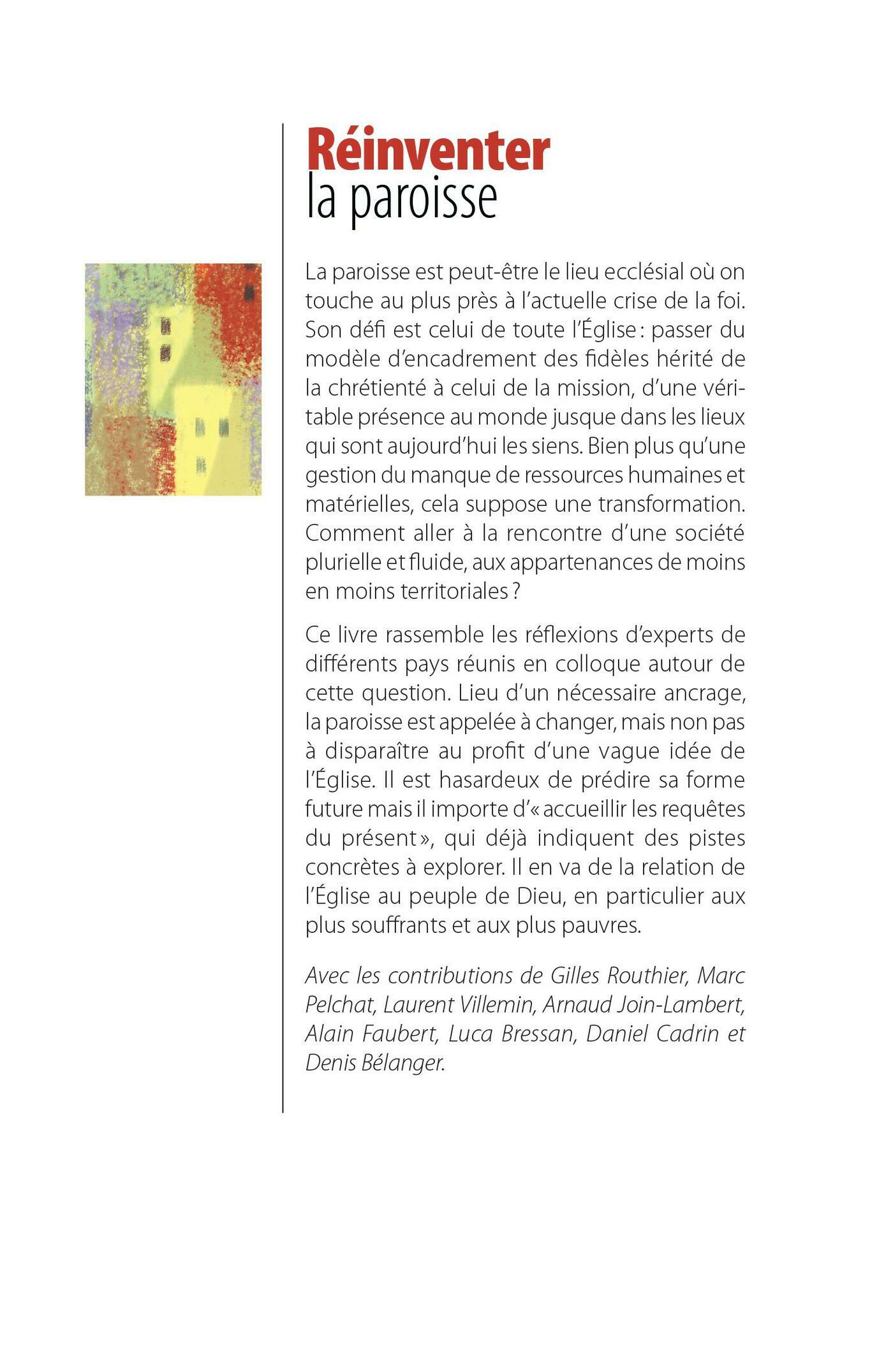 La paroisse est peut-être le lieu ecclésial où on touche au plus près à l’actuelle crise de la foi. Son défi est celui de toute l’Église : passer du modèle d’encadrement des fidèles hérité de la chrétienté à celui de la mission, d’une véritable présence au monde jusque dans les lieux qui sont aujourd’hui les siens. Bien plus qu’une gestion du manque de ressources humaines et matérielles, cela suppose une transformation. Comment aller à la rencontre d’une société plurielle et fluide, aux appartenances de moins en moins territoriales ?Ce livre rassemble les réflexions d’experts de différents pays réunis en colloque autour de cette question. Lieu d’un nécessaire ancrage, la paroisse est appelée à changer, mais non pas à disparaître au profit d’une vague idée de l’Église. Il est hasardeux de prédire sa forme future mais il importe d’« accueillir les requêtes du présent », qui déjà indiquent des pistes concrètes à explorer. Il en va de la relation de l’Église au peuple de Dieu, en particulier aux plus souffrants et aux plus pauvres.Écrit dans la mouvance du pape François, une interrogation sur le devenir de la paroisse.Une rencontre d'experts qui proposent des pistes concrètes à explorer.Destiné à tous ceux que questionnent l'avenir de l'Église et son rôle dans la société d'aujourd'hui.Avec les contributions de Gilles Routhier, Marc Pelchat, Laurent Villemin, Arnaud Join-Lambert, Alain Faubert, Luca Bressan, Daniel Cadrin et Denis Bélanger.