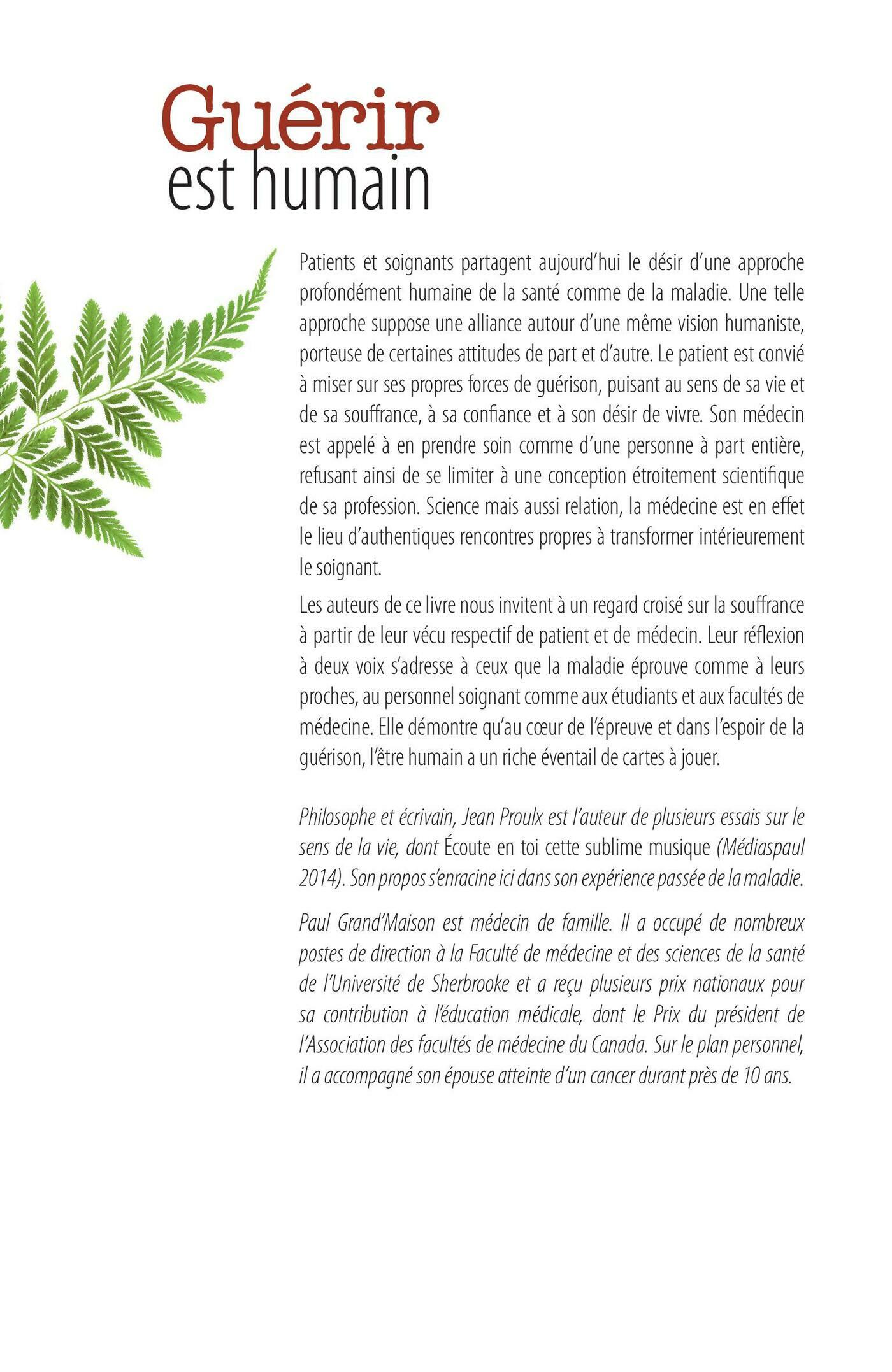Patients et soignants partagent aujourd’hui le désir d’une approche profondément humaine de la santé comme de la maladie. Le patient est convié à miser sur ses propres forces de guérison, puisant au sens de sa vie et de sa souffrance, à sa confiance et à son désir de vivre. Son médecin est appelé à en prendre soin comme d’une personne à part entière, refusant ainsi de se limiter à la conception étroitement scientifique de sa profession qui prévaut trop souvent. Science mais aussi relation, la médecine est en effet le lieu d’authentiques rencontres propres à transformer intérieurement le soignant.Les auteurs de ce livre nous invitent à un regard croisé sur la souffrance à partir de leurs expériences respectives de patient et de médecin. Leur réflexion à deux voix s’adresse à ceux que la maladie éprouve comme à leurs proches, au personnel soignant comme aux étudiants et aux facultés de médecine. Elle saura convaincre qu’au cœur de l’épreuve et dans l’espoir de la guérison, l’être humain a un riche éventail de cartes à jouer.Philosophe et écrivain, Jean Proulx est l’auteur de plusieurs essais sur le sens de la vie, dont Écoute en toi cette sublime musique (Médiaspaul 2014). Son propos s’enracine ici dans son expérience passée de la maladie.Paul Grand’Maison est médecin de famille. Il a occupé de nombreux postes de direction à la Faculté de médecine et des sciences de la santé de l’Université de Sherbrooke et a reçu plusieurs prix nationaux pour sa contribution à l’éducation médicale, dont le Prix du président de l’Association des facultés de médecine du Canada. Sur le plan personnel, il a accompagné son épouse atteinte d’un cancer durant près de 10 ans.