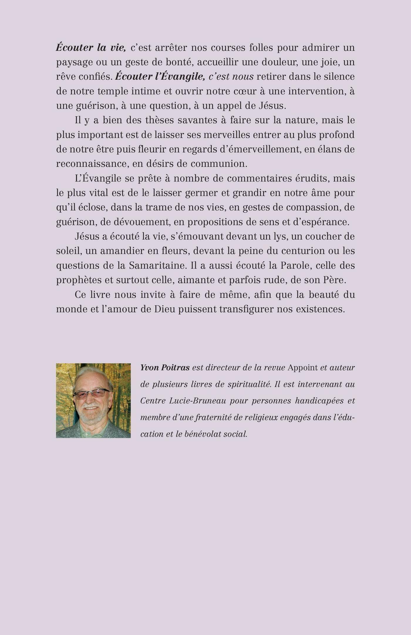 Écouter la vie, c’est arrêter nos courses folles pour admirer un paysage ou un geste de bonté, accueillir une douleur, une joie, un rêve confiés.Écouter l’Évangile, c’est nous retirer dans le silence de notre temple intime et ouvrir notre cœur à une intervention, à une guérison, à une question, à un appel de Jésus.Il y a bien des thèses savantes à faire sur la nature, mais le plus important est de laisser ses merveilles entrer au plus profond de notre être puis fleurir en regards d’émerveillement, en élans de reconnaissance, en désirs de communion.L’Évangile se prête à nombre de commentaires érudits, mais le plus vital est de le laisser germer et grandir en notre âme pour qu’il éclose, dans la trame de nos vies, en gestes de compassion, de guérison, de dévouement, en propositions de sens et d’espérance. Jésus a écouté la vie, s’émouvant devant un lys, un coucher de soleil, un amandier en fleurs, devant la peine du centurion ou les questions de la Samaritaine. Il a aussi écouté la Parole, celle des prophètes et surtout celle, aimante et parfois rude, de son Père.Ce livre nous invite à faire de même, afin que la beauté du monde et l’amour de Dieu puissent transfigurer nos existences. Un plaidoyer pour retrouver le plaisir de la contemplation du monde et l'amour de Dieu.Yvon Poitras est directeur de la revue Appoint et auteur de plusieurs livres de spiritualité. Il est intervenant au Centre Lucie-Bruneau pour personnes handicapées et membre d’une fraternité de religieux engagés dans l’éducation et le bénévolat social.