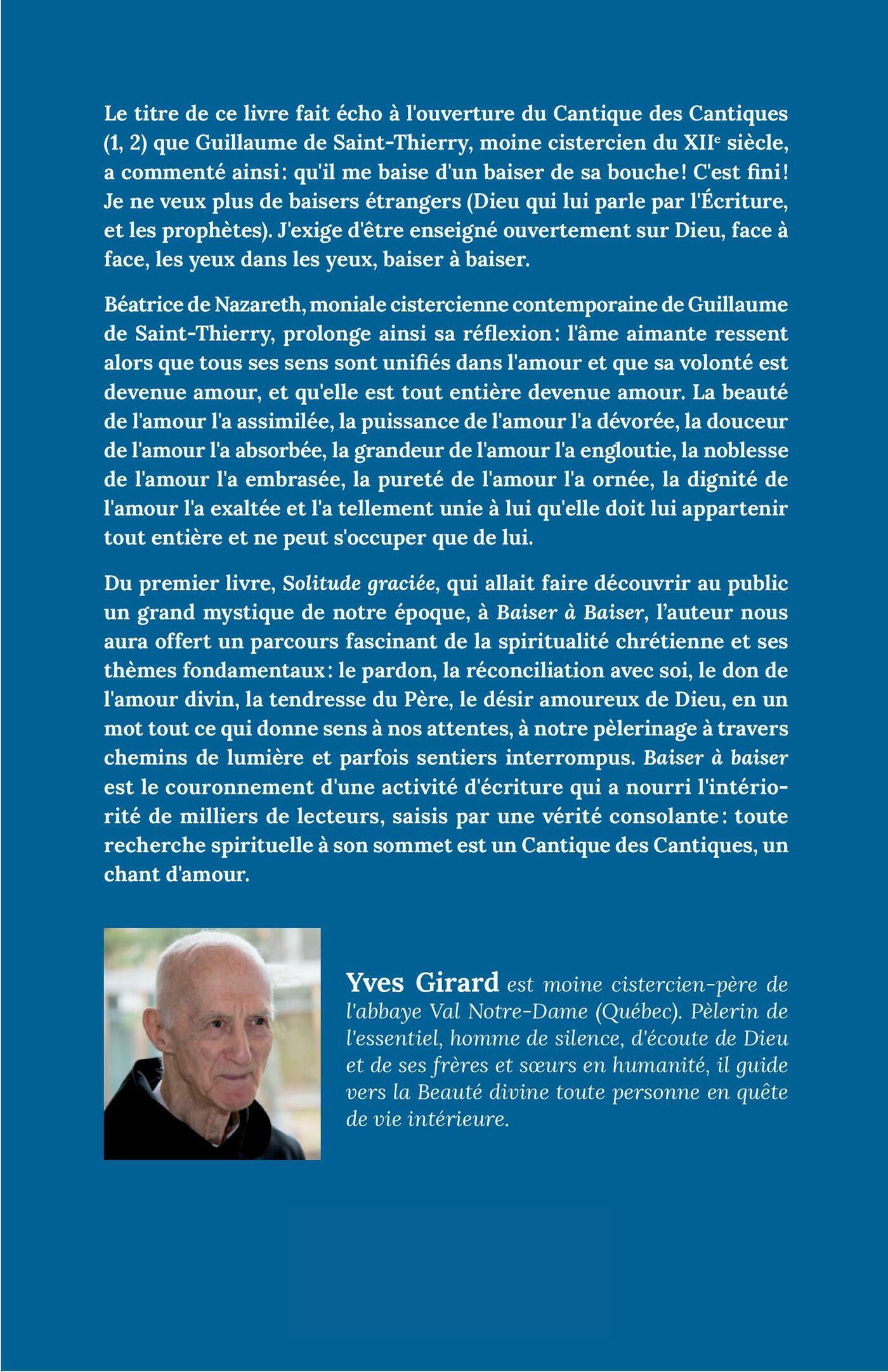 Le titre de ce livre fait écho à l’ouverture du Cantique des Cantiques (1, 2) que Guillaume de Saint-Thierry, moine cistercien du XIIe siècle, a commenté ainsi :Qu’il me baise d’un baiser de sa bouche ! C’est fini ! Je ne veux plus de baisers étrangers (Dieu qui lui parle par l’Écriture, et les prophètes). J’exige d’être enseigné ouvertement sur Dieu, face à face, les yeux dans les yeux, baiser à baiser.Béatrice de Nazareth, moniale cistercienne contemporaine de Guillaume de Saint-Thierry, prolonge ainsi sa réflexion : L’âme aimante ressent alors que tous ses sens sont unifiés dans l’amour et que sa volonté est devenue amour, et qu’elle est tout entière devenue amour : la beauté de l’amour l’a assimilée, la puissance de l’amour l’a dévorée, la douceur de l’amour l’a absorbée, la grandeur de l’amour l’a engloutie, la noblesse de l’amour l’a embrasée, la pureté de l’amour l’a ornée, la dignité de l’amour l’a exaltée et l’a tellement unie à lui qu’elle doit lui appartenir tout entière et ne peut s’occuper que de lui.De Solitude graciée, le premier livre du moine cistercien Yves Girard qui allait faire découvrir au public un grand mystique de notre époque, à Baiser à Baiser, l’auteur nous aura offert un parcours original et essentiel de la spiritualité chrétienne et ses thèmes fondamentaux : le pardon, la réconciliation avec soi, le don de l’amour divin, la tendresse du Père, le désir amoureux de Dieu, en un mot tout ce qui donne sens à nos attentes, à notre pèlerinage à travers chemins de lumière et parfois sentiers interrompus. Baiser à baiser est le couronnement d’une activité d’écriture qui a nourri l’intériorité des milliers de lecteurs habité par une vérité consolante : toute recherche spirituelle à son sommet est un Cantique des Cantiques, un chant d’amour.Yves Girard est père et moine cistercien de l’abbayeVal Notre-Dame (Québec). Pèlerin de l’essentiel, homme de silence, d’écoute de Dieu et de ses frères et sœurs en humanité, il guide vers la Beauté divine toute personne en quête de vie intérieure.