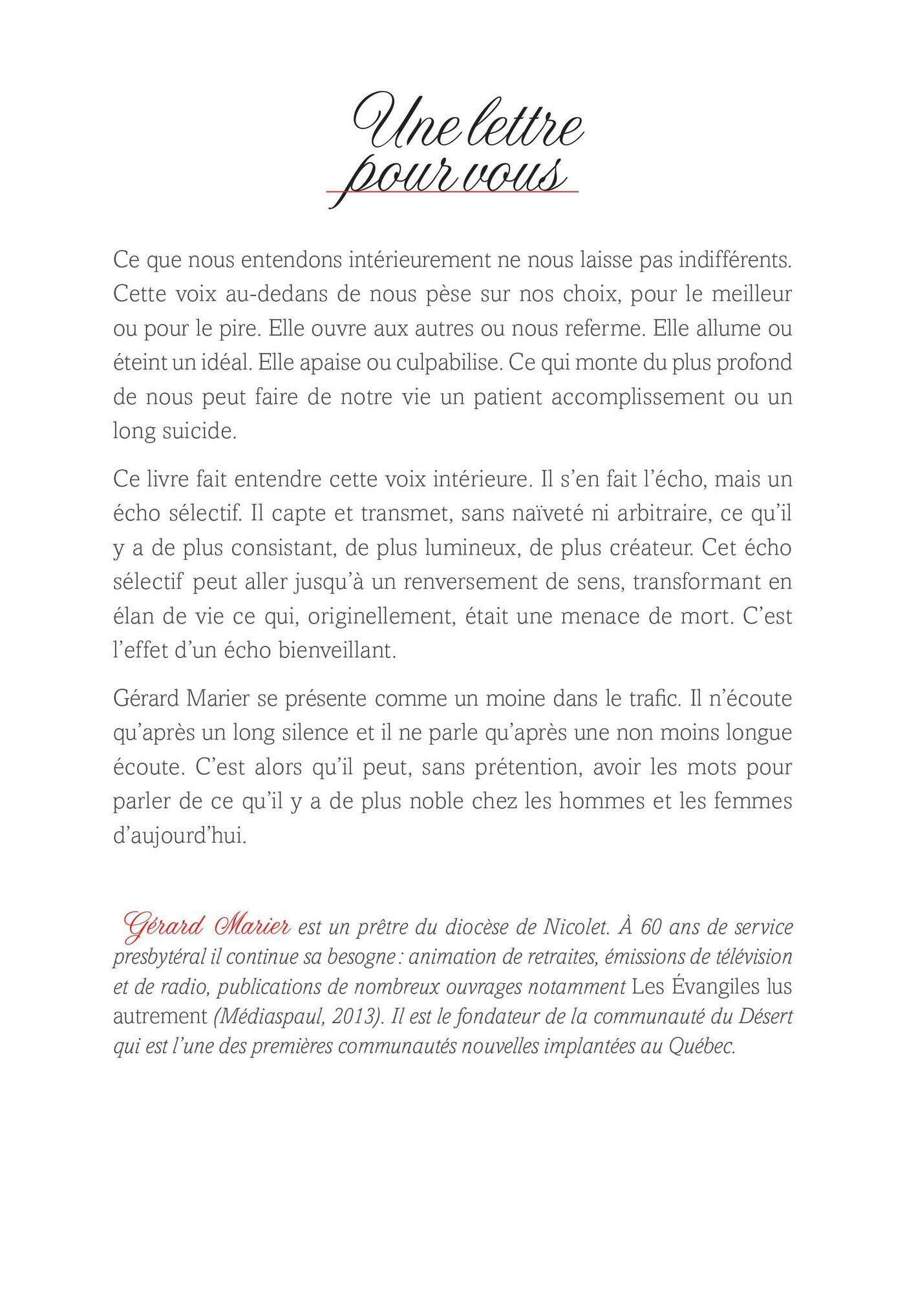 Ce que nous entendons intérieurement ne nous laisse pas indifférents. Cette voix au-dedans de nous pèse sur nos choix, pour le meilleur ou pour le pire. Elle ouvre aux autres ou nous referme. Elle allume ou éteint un idéal. Elle apaise ou culpabilise. Ce qui monte du plus profond de nous peut faire de notre vie un patient accomplissement ou un long suicide.Ce livre fait entendre cette voix intérieure. Il s’en fait l’écho, mais un écho sélectif. Il capte et transmet, sans naïveté ni arbitraire, ce qu’il y a de plus consistant, de plus lumineux, de plus créateur. Cet écho sélectif peut aller jusqu’à un renversement de sens, transformant en élan de vie ce qui, originellement, était une menace de mort. C’est l’effet d’un écho bienveillant.Gérard Marier se présente comme un moine dans le trafic. Il n’écoute qu’après un long silence et il ne parle qu’après une non moins longue écoute. C’est alors qu’il peut, sans prétention, avoir les mots pour parler de ce qu’il y a de plus noble chez les hommes et les femmes d’aujourd’hui. Une invitation au dialogue et à la réflexion animée par une vision pragmatique et positive de la destinée humaine.Gérard Marier est un prêtre du diocèse de Nicolet. À 60 ans de service presbytéral il continue sa besogne: animation de retraites, émissions de télévision et de radio, publications de nombreux ouvrages notamment Les Évangiles lus autrement (Médiaspaul, 2013). Il est le fondateur de la communauté du Désert qui est l'une des communautés nouvelles les plus anciennes du Québec.
