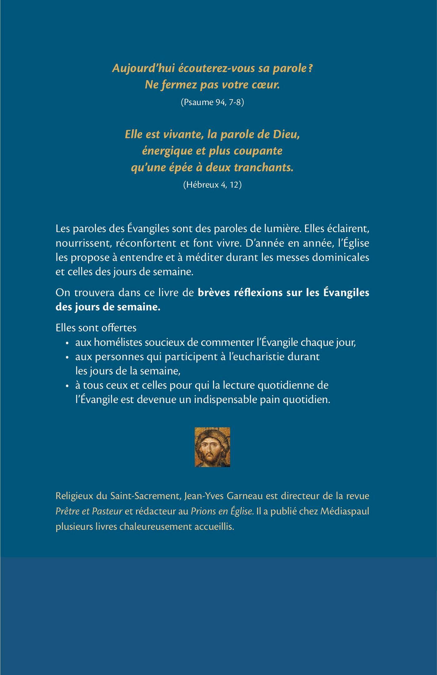 Les paroles des Évangiles sont des paroles de lumière. Elles éclairent, nourrissent, réconfortent et font vivre. D’année en année, l’Église les propose à entendre et à méditer durant les messes dominicales et celles des jours de semaine.On trouvera dans ce livre sur les Évangiles des jours de semaine, un bref extrait de l’évangile du jour, quelques lignes de réflexion et quelques mots de prière ou de louange qui peuvent être répétés plusieurs fois au long du jour. Ce livre est particulièrement destiné aux homélistes soucieux de commenter l’Évangile chaque jour, aux personnes qui participent à l’eucharistie durant les jours de la semaine, et à toutes celles qui souhaitent se nourrir de la lecture de l’Évangile.- Des commentaires de l’Évangile accessibles et inspirants- Un auteur apprécié d’un vaste lectorat pour son talent de communicateur de la Parole- Un précieux outil pour la prière et la vie spirituelleReligieux du Saint-Sacrement, Jean-Yves Garneau est directeur de la revue Prêtre et Pasteur et rédacteur au Prions en Église. Il a publié de nombreux livres chez Médiaspaul, toujours chaleureusement accueillis par le public.