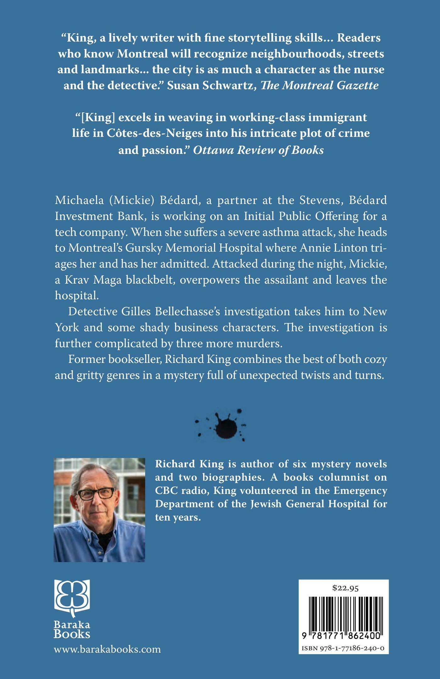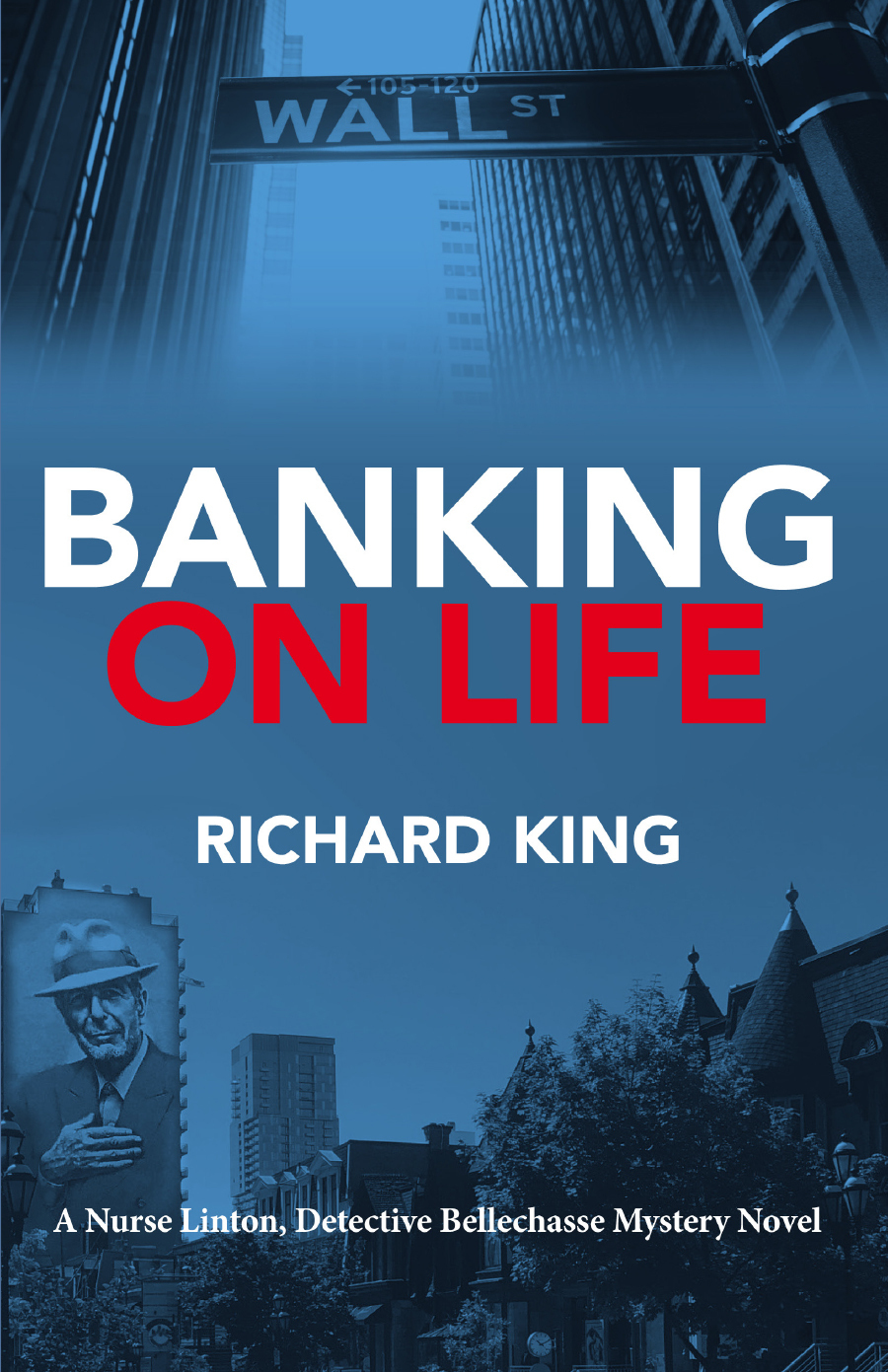Michaela (Mickie) Bédard works at the Stevens, Bédard Investment Bank, a bank founded by her great grandfather. She is working on an Initial Public Offering for a technology company. Walking home one evening she suffers a severe asthma attack and heads to Montreal’s Gursky Memorial Hospital. Triaged by Annie Linton, she is kept in the hospital overnight. During her stay, an unknown assailant attacks Mickie in her room.When a murder victim is discovered at the Gursky, Detective Sergeant Gilles Bellechasse is called upon to investigate.The investigation leads Gilles to New York and to a network of shady characters operating in New York and in Montreal who are trying to steal the deal from Mickie. The investigation is further complicated by three more murders. King brilliantly combines the best elements of a cozy with a gritty police procedural in a novel full of twists and unexpected turns. Annie’s clever insights are critical in solving the crimes.Banking on Life is the second Annie Linton, Gilles Bellechasse mystery novel. Recovering bookseller Montrealer Richard King once again reveals his keen sense of metropolitan life in Montreal and New York City.Richard King is author of six mystery novels and two biographies. A books columnist on CBC radio, King volunteered in the Emergency Department of the Jewish General Hospital for ten years.About A Stab at Life, the first novel in this series:“King, a lively writer with fine storytelling skills… Readers who know Montreal will recognize neighbourhoods, streets and landmarks in A Stab at Life. Indeed, the city is as much a character as the nurse and the detective.” Susan Schwartz, The Montreal Gazette.[King] excels in weaving in working-class immigrant life in Côtes-des-Neiges into his intricate plot of crime and passion.” The Ottawa Review of Books“A Stab at Life is a top-notch Montreal crime tale. When it comes to masterful storytelling, Richard is King.” Andreas Kessaris, bookseller and author of The Butcher of Park Ex & Other Semi-Truthful Tales