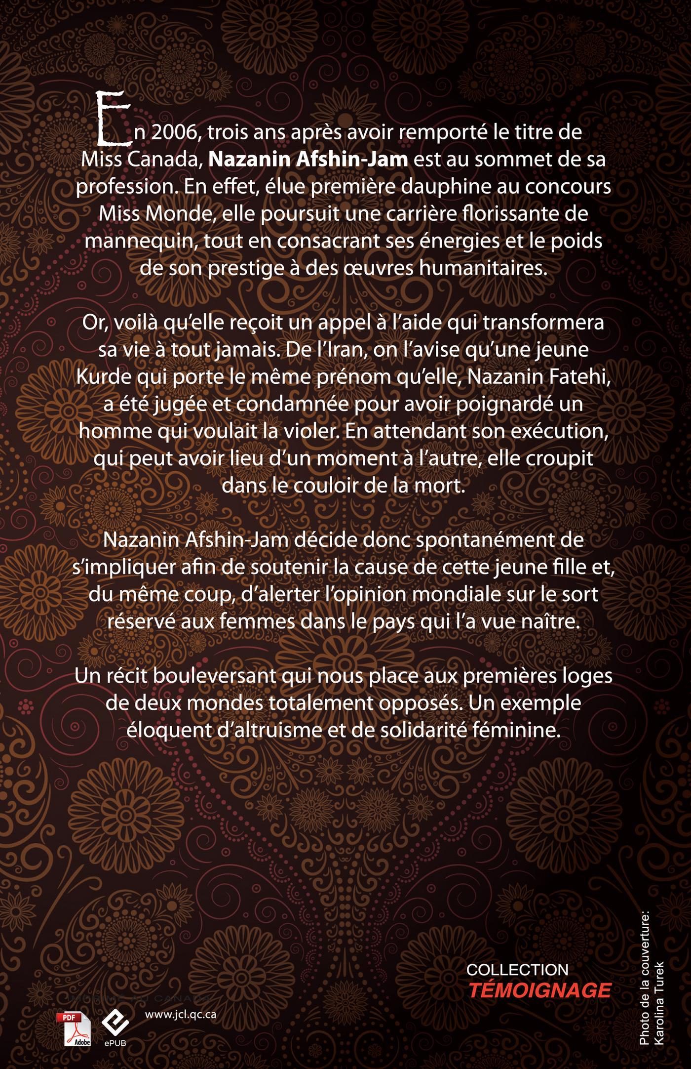 Cette histoire remarquable est celle de deux femmes nommées Nazanin, – l’une, Canadienne au sommet de sa carrière et l’autre, une adolescente iranienne incarcérée dans le couloir de la mort –, mais surtout d’un courriel qui a transformé leurs vies à jamais.Nazanin Afshin-Jam s’était hissée au sommet. En 2006, elle venait de signer un premier contrat d’enregistrement de disque, avait été élue première dauphine au concours Miss Monde trois ans plus tôt, poursuivait une carrière florissante de mannequin et était devenue une véritable icône de la communauté internationale des dissidents iraniens. Mais un après-midi, elle reçut un courriel qui allait bouleverser son existence.Elle apprend alors qu'une adolescente kurde nommée Nazanin Fatehi risque la peine de mort en Iran, suite à une condamnation pour avoir poignardé un homme qui voulait la violer. Peu de temps après, madame Afshin-Jam s’engage à prendre sa défense. Cette décision l‘amène à plonger dans le monde de la diplomatie internationale et à affronter le côté sombre du pays qui l’a vue naître, avec ses crimes d’honneur, la violence faite aux femmes et l’exécution d’enfants, sanctionnée par l’État. Pendant que Nazanin Fatehi dépérit en prison, dans des conditions si atroces qu’elle tente de mettre fin à ses jours, madame Afshin-Jam travaille sans relâche à mettre en œuvre une campagne visant à lui sauver la vie.