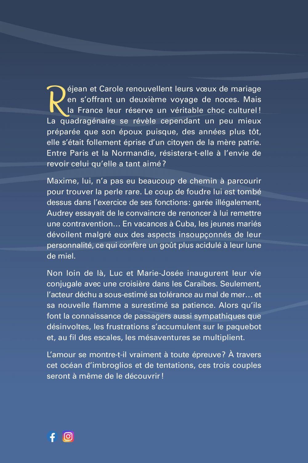 Réjean et Carole renouvellent leurs vœux de mariage en s’offrant un deuxième voyage de noces. Mais la France leur réserve un véritable choc culturel ! La quadragénaire se révèle cependant un peu mieux préparée que son époux puisque, des années plus tôt, elle s’était follement éprise d’un citoyen de la mère patrie. Entre Paris et la Normandie, résistera-t-elle à l’envie de revoir celui qu’elle a tant aimé ?Maxime, lui, n’a pas eu beaucoup de chemin à parcourir pour trouver la perle rare. Le coup de foudre lui est tombé dessus dans l’exercice de ses fonctions : garée illégale-ment, Audrey essayait de le convaincre de renoncer à lui remettre une contravention… En vacances à Cuba, les jeunes mariés dévoilent malgré eux des aspects insoupçonnés de leur personnalité, ce qui confère un goût plus acidulé à leur lune de miel.Non loin de là, Luc et Marie-Josée inaugurent leur vie conjugale avec une croisière dans les Caraïbes. Seulement, l’acteur déchu a sous-estimé sa tolérance au mal de mer… et sa nouvelle flamme a surestimé sa patience. Alors qu’ils font la connaissance de passa-gers aussi sympathiques que désinvoltes, les frustrations s’accumulent sur le paquebot et, au fil des escales, les mésaventures se multiplient.L’amour se montre-t-il vraiment à toute épreuve ? À travers cet océan d’imbroglios et de tentations, ces trois couples seront à même de le découvrir !