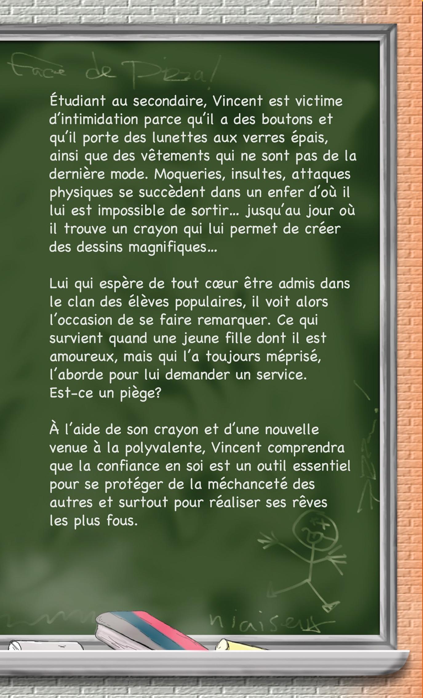 Parce qu'il a des boutons d'acné et ne porte pas de vêtements griffés, Vincent, 12 ans, est victime d'intimidation à l'école secondaire. Alors que tout ce qu'il désire est d'être accepté des autres, c'est exactement le contraire qui se produit. Ses pires ennemis, le groupe des populaires, s'en donnent à cœur joie pour lui faire vivre les pires sévices physiques et psychologiques: on le traite de noms, lui crache à la figure, lui arrache ses vêtements, l'enferme à clef dans son casier, le menace de mort, lui vole son lunch le midi, lui casse la gueule devant tout le monde...Puis, un beau midi, Vincent fait la découverte d'un crayon grâce auquel il se découvre un talent en dessin. Au même moment, il fait la rencontre de Vicky, nouvellement arrivée dans le quartier, une fille qui a une façon bien particulière de voir les choses. Aidé de son crayon et de sa nouvelle amie, Vincent remportera un prestigieux concours de dessins, qui fera de lui une coqueluche à la polyvalente. Son apparition à Jeunesse en vedette, une émission de télévision populaire diffusée sur les ondes de Radio-Canada, ne passera pas inaperçue, surtout pas aux yeux des populaires. Alors qu'il obtient enfin le succès dont il a toujours rêvé, Vincent sera contraint de réaliser malgré lui que la popularité a un prix. Jusqu'où sera-t-il prêt à aller pour faire partie de la gang?