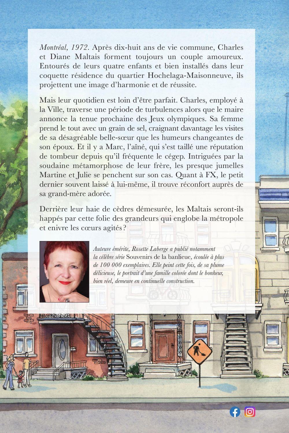 Montréal, 1972. Après dix-huit ans de vie commune, Charles et Diane Maltais forment toujours un couple amoureux. Entourés de leurs quatre enfants et bien installés dans leur coquette résidence du quartier Hochelaga-Maisonneuve, ils projettent une image d’harmonie et de réussite.Mais leur quotidien est loin d’être parfait. Charles, employé à la Ville, traverse une période de turbulences alors que le maire annonce la tenue prochaine des Jeux olympiques. Sa femme prend le tout avec un grain de sel, craignant davantage les visites de sa désagréable belle-sœur que les humeurs changeantes de son époux. Et il y a Marc, l’aîné, qui s’est taillé une réputation de tombeur depuis qu’il fréquente le cégep. Intriguées par la soudaine métamorphose de leur frère, les presque jumelles Martine et Julie se penchent sur son cas. Quant à FX, le petit dernier souvent laissé à lui-même, il trouve réconfort auprès de sa grand-mère adorée.Derrière leur haie de cèdres démesurée, les Maltais seront-ils happés par cette folie des grandeurs qui englobe la métropole et enivre les cœurs agités ?Auteure émérite, Rosette Laberge a publié notamment la célèbre série Souvenirs de la banlieue, écoulée à plus de 100 000 exemplaires. Elle peint cette fois, de sa plume délicieuse, le portrait d’une famille colorée dont le bonheur, bien réel, demeure en continuelle construction.