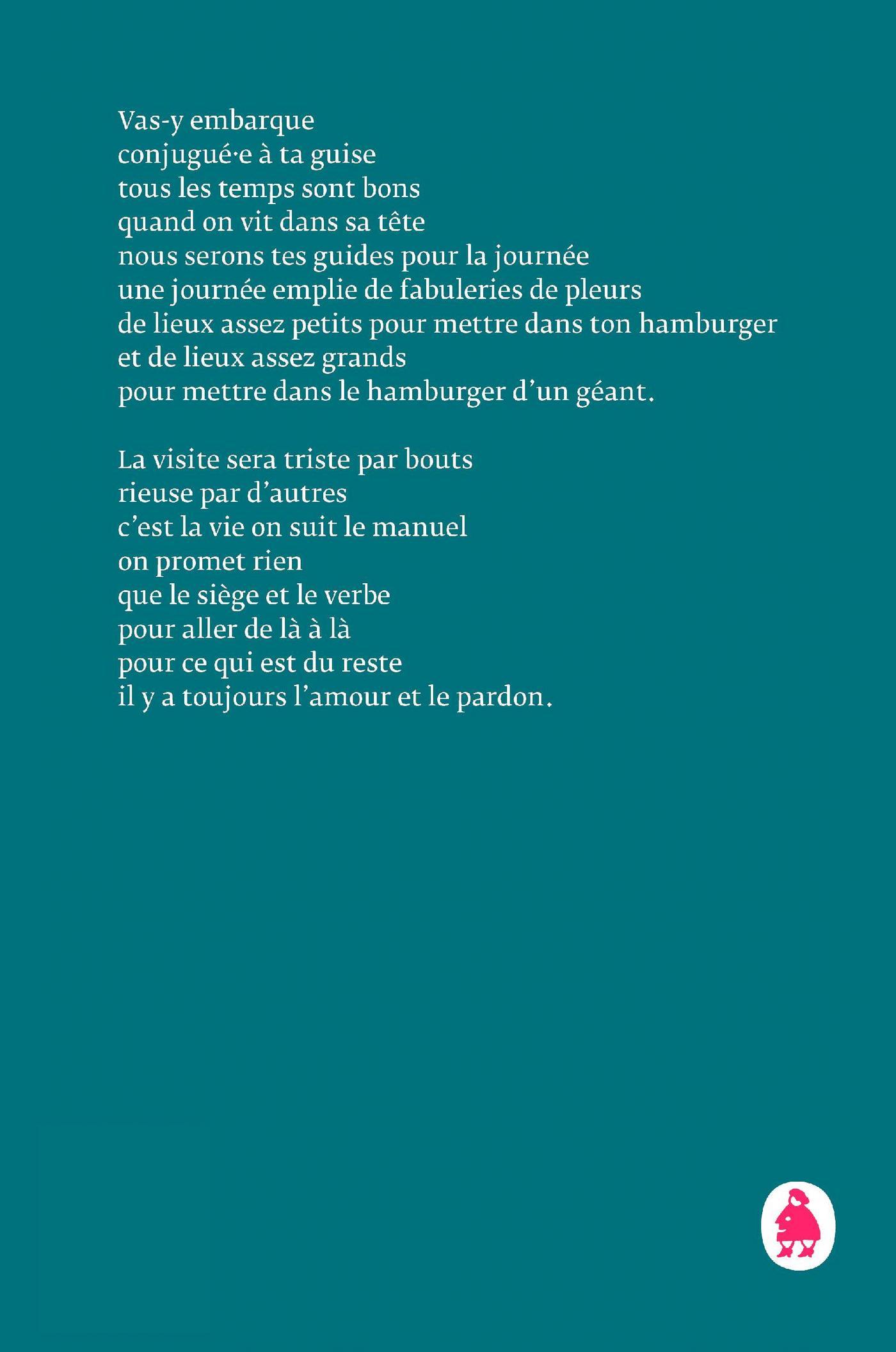 Vas-y embarque / conjugué·e à ta guise / tous les temps sont bons / quand on vit dans sa tête / nous serons tes guides pour la journée / une journée emplie de fabuleries de pleurs / de lieux assez petits pour mettre dans ton hamburger / et de lieux assez grands / pour mettre dans le hamburger d’un géant. // La visite sera triste par bouts / rieuse par d’autres / c’est la vie on suit le manuel / on promet rien / que le siège et le verbe / pour aller de là à là / pour ce qui est du reste / il y a toujours l’amour et le pardon.//Verdunland est une visite guidée dans un Verdun parallèle et fantasmé, dont on ressort indemne après la lecture.