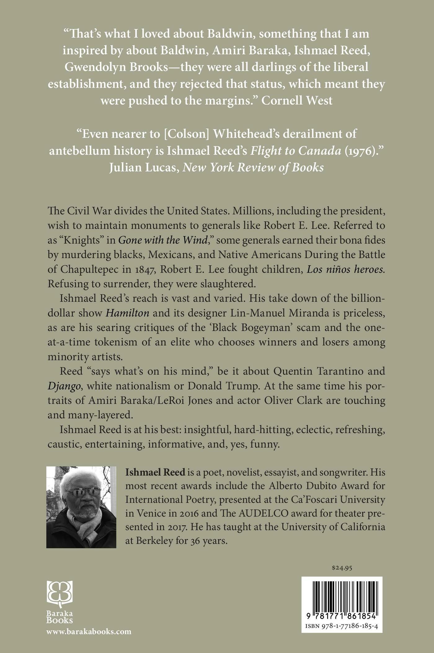 The Civil War divides the United States. Millions, including the president, wish to maintain monuments to generals like Robert E. Lee. Referred to as “Knights” in Gone with the Wind,” some generals earned their bona fides by murdering blacks, Mexicans, and Native Americans During the Battle of Chapultepec in 1847, Robert E. Lee fought children, Los niños heroes. Refusing to surrender, they were slaughtered.Ishmael Reed’s reach is vast and varied. His take down of the billion-dollar show Hamilton and its designer Lin-Manuel Miranda is priceless, as are his searing critiques of the ‘Black Bogeyman’ scam and the one-at-a-time tokenism of an elite who chooses winners and losers among minority artists.Reed “says what’s on his mind,” be it about Quentin Tarantino and Django, white nationalism or Donald Trump. At the same time his portraits of Amiri Baraka/LeRoy Jones and actor Oliver Clark are touching and many-layered.About Why No Confederate Statues in Mexico"Ishmael Reed is the purest literary troublemaker we currently have’ – The Buffalo NewsAbout Ishmael Reed and his WorkThat’s what I loved about Baldwin, something that I am inspired by about Baldwin, Amiri Baraka, Ishmael Reed, Gwendolyn Brooks—they were all darlings of the liberal establishment, and they rejected that status, which meant they were pushed to the margins.” Cornell West“Even nearer to [Colson] Whitehead’s derailment of antebellum history is Ishmael Reed’s Flight to Canada (1976).” Julian Lucas, New York Review of Books“It was a ceremonial rite of some magnitude when the great American writer, cultural theorist, and musician Ishmael Reed played a jazz composition on the piano.”—Vogue, 17 Feb. 2019, coverage of Grace Wales Bonner’s London fashion show.