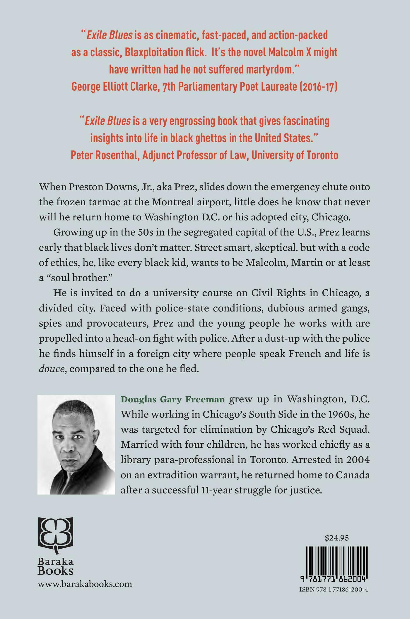 When Preston Downs, Jr., aka Prez, slides down the emergency chute onto the frozen tarmac at the Montreal airport, little does he know that never would he return home to Washington D.C. or to his adopted city, Chicago. Events had sped by after a dust-up with the Chicago police. With a new name and papers, he finds himself in a foreign city where people speak French and life is douce compared to the one he fled.Son of a World War II vet, Prez grows up in the 50s in D.C., a segregated Southern city, and learns early that black lives don’t matter. As a leader in the streets, his journey from boy to man means acquiring fighting skills to lead and unify long before losing his virginity. Smart and skeptical, but with a code of ethics, he, like every black kid, wants to be Malcolm, Martin or at least a “soul brother,” which inspires fear among the powers that be.Spotted while an A student at Howard University in 1964, Prez is invited to do an interdisciplinary course with field work on Civil Rights in Chicago, a city as divided as Gettysburg was a hundred years earlier. Faced with police-state conditions, dubious armed gangs, spies and provocateurs, Prez and the young women and men he works with are propelled into a head-on fight with police.James Baldwin wrote that the blues began “on the auction block,” others say it started with their kidnapping from Africa. Prez was born in exile, with the blues.Only someone who has lived through that period can write an enthralling and passionate story like Exile Blues. Gary Freeman has done so with insight and sensitivity.A Novel Inspired by True Events"Exile Blues is as cinematic, fast-paced, and action-packed as a classic, Blaxploitation flick. It’s the novel Malcolm X might have written had he not suffered martyrdom.” —George Elliott Clarke, author of George & Rue, 7th Parliamentary Poet Laureate (2016 & 2017)“Drawing on his incredible personal experience of a violent and transformative era in American race politics, Gary Freeman has produced one heck of a good book.” —Thomas Mulcair, Former Leader of the NDP“To read Exile Blues is to step into the US of the 50s and 60s, to engage with African-American youth at the frontlines of fighting and protesting for freedom and equal rights… an engaging and multi-faceted narrative of survival and strength.” — Terese Mason Pierre,Quill & Quire“Exile Blues could be one of the most important Black History novels to appear in recent years, and Mr. Freeman is a writer worthy of consideration.” — The Miramichi Reader