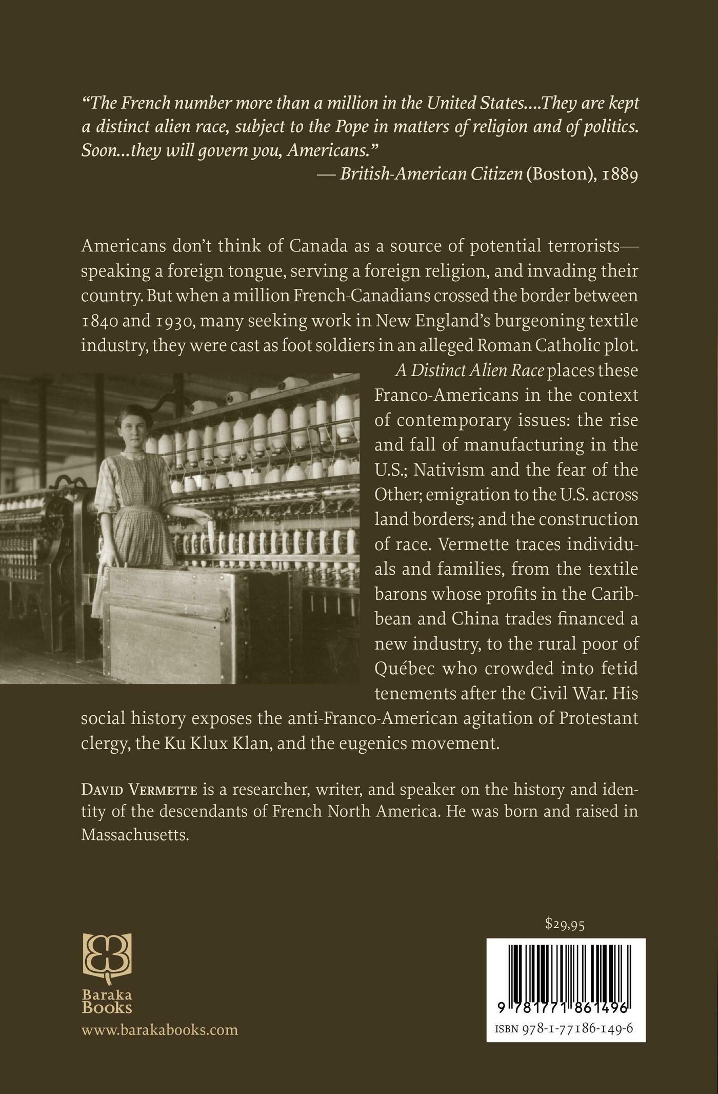 Americans don’t think of Canada as a source of potential terrorists—speaking a foreign tongue, serving a foreign religion, and invading their country. But when a million French-Canadians crossed the border between 1840 and 1930, many seeking work in New England’s burgeoning textile industry, they were cast as foot soldiers in an alleged Roman Catholic plot.A Distinct Alien Race places these Franco-Americans in the context of contemporary issues: the rise and fall of manufacturing in the U.S.; Nativism and the fear of the Other; emigration to the U.S. across land borders; and the construction of race. Vermette traces individuals and families, from the textile barons whose profits in the Caribbean and China trades financed a new industry, to the rural poor of Québec who crowded into fetid tenements after the Civil War. His social history exposes the anti-Franco-American agitation of Protestant clergy, the Ku Klux Klan, and the eugenics movement.Author: David Vermette is a researcher, writer, and speaker on the history and identity of the descendants of French North America. He was born and raised in Massachusetts.Reviews“the work of David Vermette on the French-Canadians who migrated from Quebec to the United States from the 1860s to the early decades of the twentieth century constitutes the equivalent of a gold mine.” Vincent Geloso, EH.net (Economic History Association)“First, let me say simply that this is a terrific book, the best synthesis of Franco-American history written to date…Both the research and prose are wonderful…Everyone with an interest in Franco-Americans should read this book.” Leslie Choquette, Résonance Vol. 1 , Article 24.“Readers interested in Canadian and American immigration history will appreciate the depth of Vermette’s research and the fascinating story he tells.” Publishers Weekly“Meticulously researched and overflowing with facts, yet so well written that it’s difficult to put down, the book tells a story few Americans are aware of.” Emilie Noelle Provost, The Bean Magazine (Lowell, Mass.)