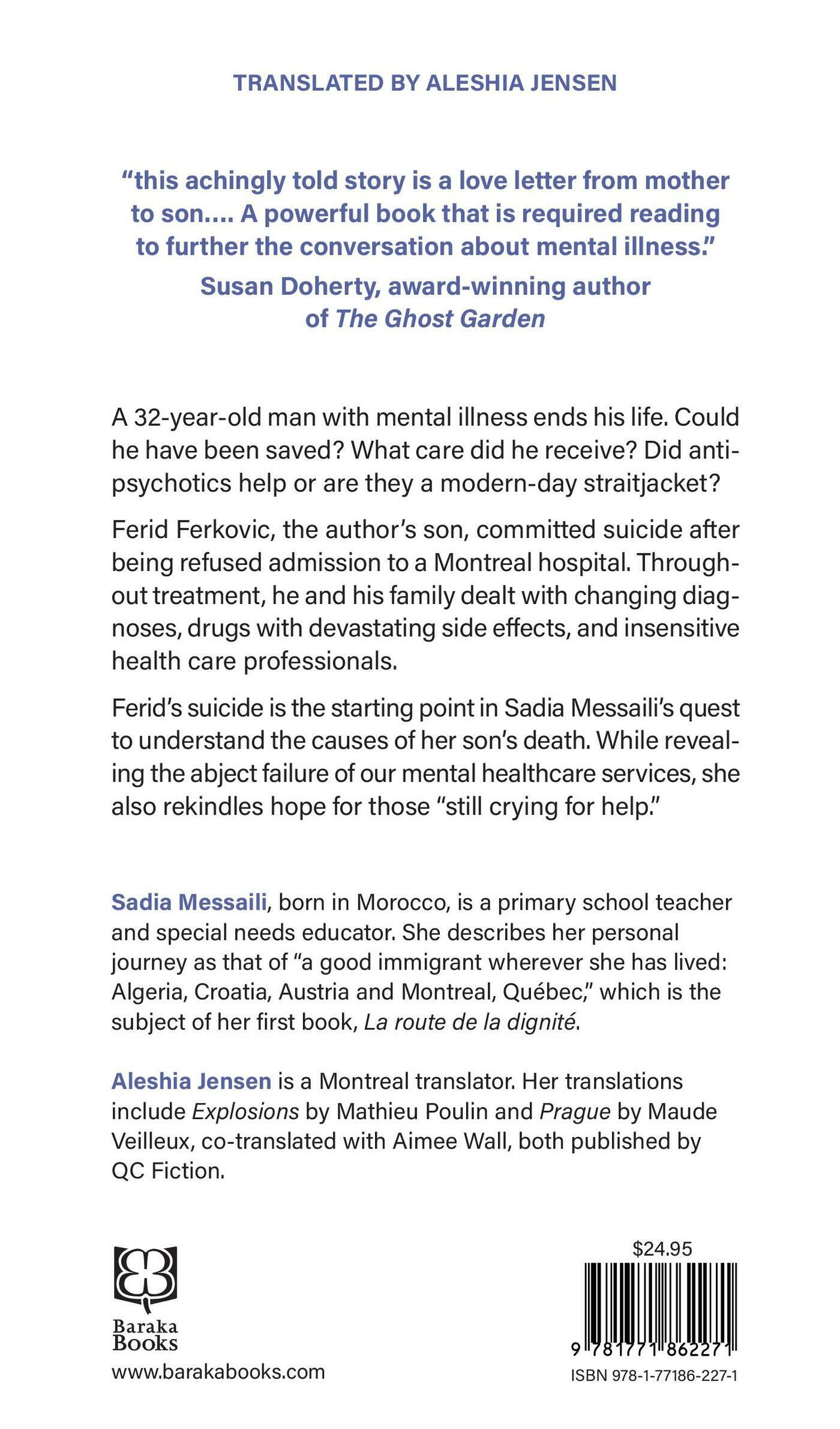 A 32-year-old man with mental illness ends his life. Could he have been saved? What care did he receive? Did antipsychotics help or are they a modern-day straitjacket?Ferid Ferkovic, the author’s son, committed suicide after being refused admission to a Montreal hospital. Throughout treatment, he and his family dealt with changing diagnoses, drugs with devastating side effects, and insensitive health care professionals.The suicide of Sadia Messaili’s son Ferid Ferkovic, who immigrated to Canada with his family at the age of 12, is the starting point in a challenging quest for truth. First about our failing mental health care system. Then about justice. And finally about better ways to rekindle hope among people who are “still crying for help.”Sadia Messaili, born in Morocco, is a primary school teacher and special needs educator. She describes her personal journey as that of “a good immigrant wherever she has lived: Algeria, Croatia, Austria and Montreal, Québec.” Her first book about forced migratory wandering is titled La route de la dignité.Aleshia Jensen is Montreal translator. Her translations include Explosions by Mathieu Poulin and Prague by Maude Veilleux, co-translated with Aimee Wall, both published by QC Fiction.Reviews“[Messaili] describes an environment that is coercive, punitive, and shaped to cater to doctors’ egos rather than patients’ needs. Instead of being listened to, Ferid [Messaili’s son] is drugged into submission… those who have tried to navigate the labyrinthine and under-resourced mental health system will find validation in [her] words.” Anne Thériault, Quill & Quire“This is an important book for those that are on both sides of the mental health equation. It shows what a grieving parent goes through (“We grieve twice” she tells us) as they come up against a system that just does not work.” James Fisher, The Miramichi ReaderPraise“Full of agony, disbelief, and blind determination, this achingly told story is a love letter from mother to son. Sadia retraces the journey of Ferid’s life mired by multifarious treatment options, none of which rescue him from an assortment of imprecise and ever-changing psychiatric diagnoses. “Painfully underlined is the expectation we all have that our medical system will intervene with therapeutic solutions, not just for physical illness, but for mental illness. The redemption of that failure can be found with alternative therapies beyond what pharmaceutical companies could ever hope to deliver. The stark truth is that reductionist biological theories have led to hopelessness and even suicide. “A powerful book that is required reading to further the conversation about mental illness. It is a vital addition to a long list that raises public consciousness surrounding mental illness.” Susan Doherty, author of Ghost Garden, Inside the Lives of Schizophrenias Feared and Forgotten (PenguinRandomHouse 2019)