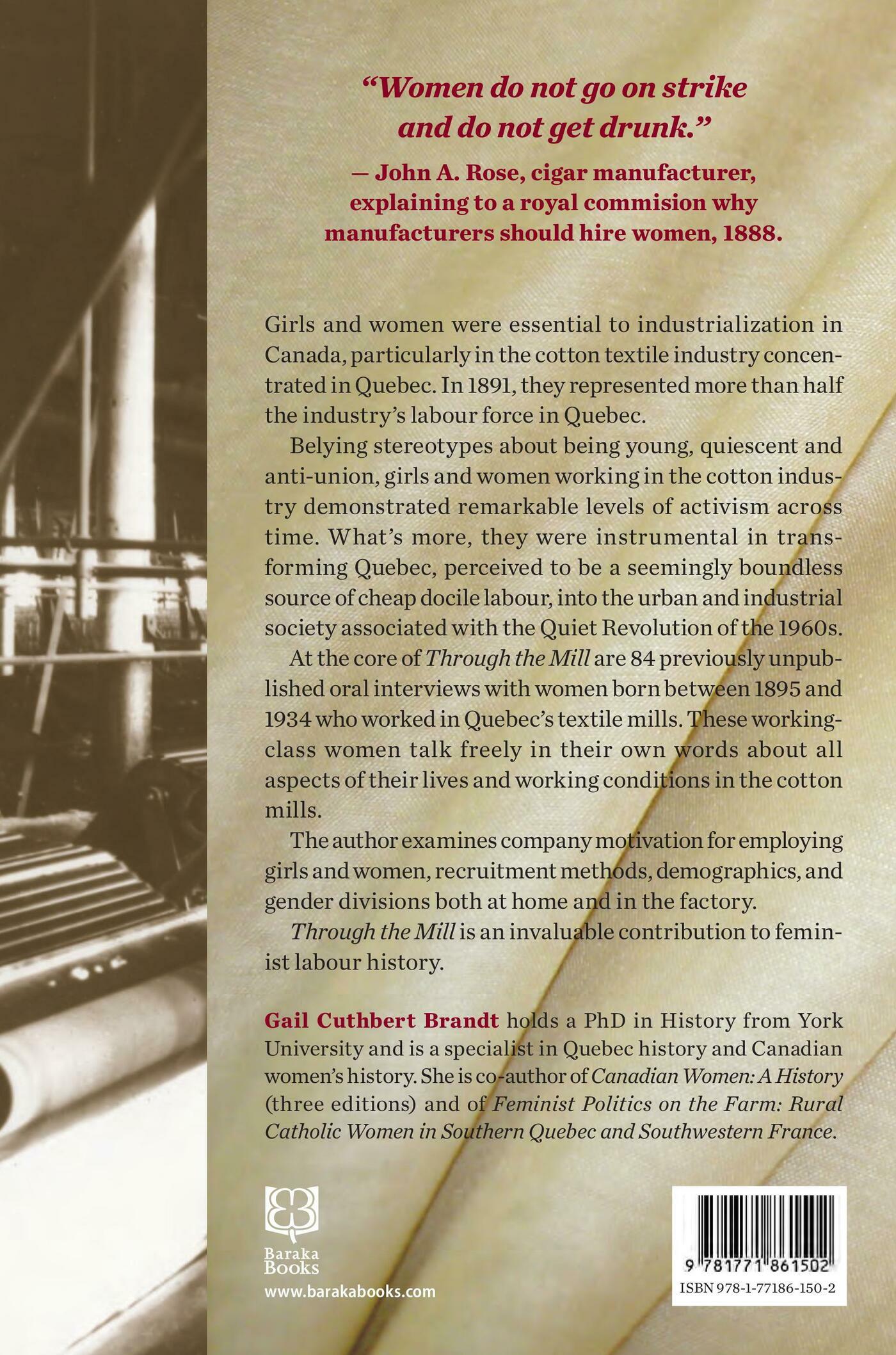 Girls and women were essential to industrialization in Canada, particularly in the cotton textile industry, which was concentrated in Quebec. In 1891, for example, more than 2000 girls and women toiled in Quebec’s cotton mills, representing more than half the industry’s labour force in Quebec.Conventional wisdom would have it that young girls and women were most often quiescent workers who undercut unions’ organizing efforts. In fact, women cotton workers demonstrated remarkable levels of labour activism and militancy across time. these girls and women were instrumental in transforming Quebec, perceived to be a seemingly boundless source of cheap docile labour, into an increasingly urban and industrial society thus heralding the Quiet Revolution of the 1960s.At the core of Through the Mill are 84 previously unpublished oral interviews with women born between 1895 and 1934 who worked in Quebec’s cotton textile mills. These working-class women are given a chance to talk freely and in their own words about all aspects of their lives and working conditions in the cotton mills.Gail Cuthbert Brandt also examines the companies’ motivation for employing girls and women, their recruitment methods, demographics, and gender divisions both at home and in the factory, with an eye on changing economic conditions, cultural and social attitudes, and technologies.Through the Mill is an invaluable contribution to feminist labour history and among a handful of studies to analyse the lives of women industrial workers in Canada.Author: Gail Cuthbert Brandt is a specialist in Quebec history and Canadian women’s history. She is co-author of Canadian Women: A History (three editions) and of Feminist Politics on the Farm: Rural Catholic Women in Southern Quebec and Southwestern France. She holds a PhD in History from York University. She taught for 20 years at York University’s bilingual campus, Glendon College, and was named Principal of Renison University College at the University of Waterloo in 1992. A former president of the Canadian Historical Association, Dr. Cuthbert Brandt is also a founding member and former executive officer of the Ontario Women’s History Network and a member of the Canadian Committee on Women’s History.Review:“The women of Through the Mill were long silenced: by their bosses, the Church, and even their families. This study, and their voices, force us to reckon with them not as archetypes but as individuals; not as abstract martyrs, but as clever acrobats, juggling oft-irreconcilable expectations.” Mathilde Montpetit, Montreal Review of Books