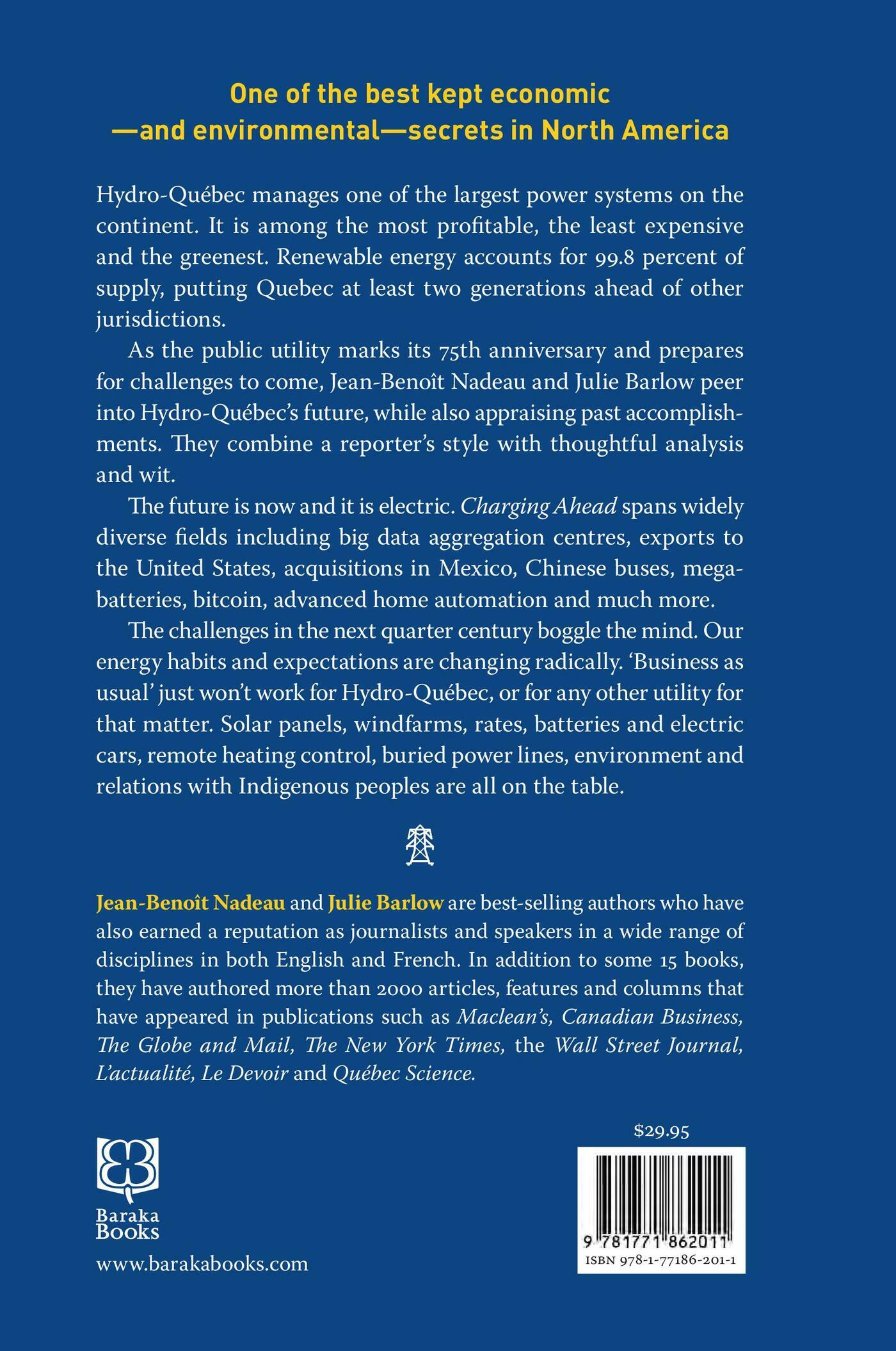 Hydro-Québec manages one of the largest power grids on the continent. It is among the most profitable, the least expensive and the greenest. With a stunning renewable energy rate of 99.8 percent, Quebec has two-generation advance on places like California and Ontario.Combining a reporters’ style with thought, philosophy and a touch of humour, Jean-Benoît Nadeau and Julie Barlow look into Hydro-Québec’s future – with an eye also on the past – as the public utility marks the 75th anniversary of its founding.The future is now and it is electric. It spans widely diverse fields such as big data aggregation centres, exports to the United States, acquisitions in Mexico, Chinese buses, mega-batteries, bitcoins, charging stations and much more.Between now, as Hydro-Québec marks its 75th year, and the utility’s 100th anniversary, the challenges will be vast. As our habits and expectations change radically everything will be on the table, from solar panels to rates, from remote heating control to underground power lines, and from the environment to relations with the indigenous peoples.