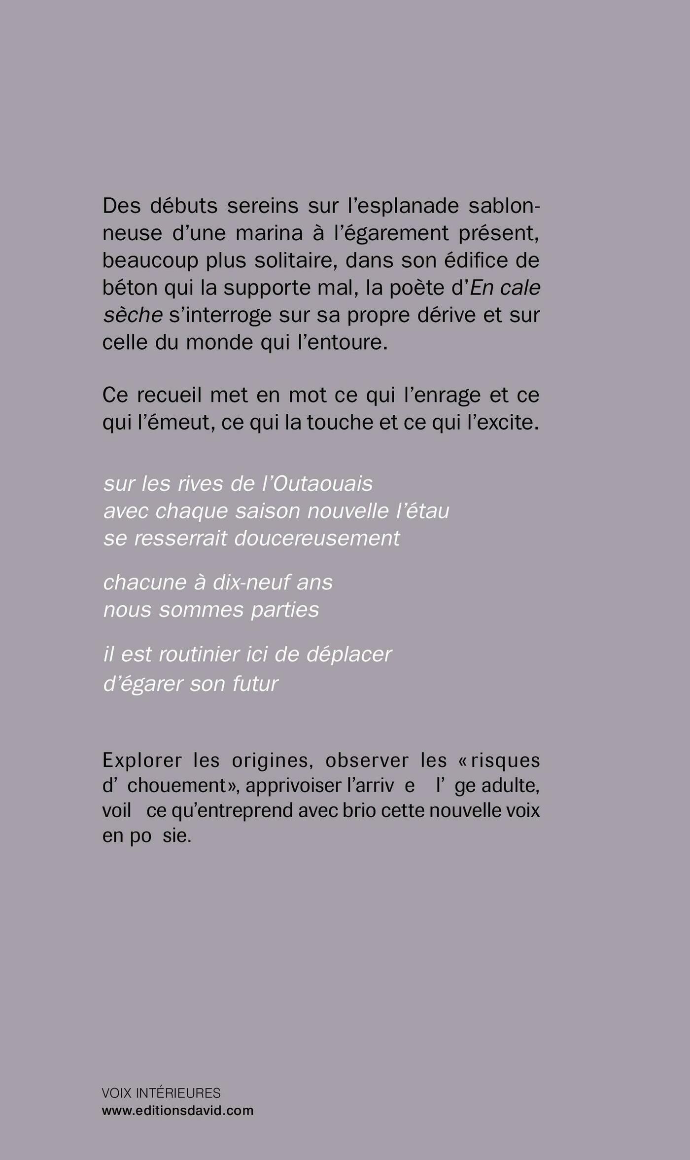 Des débuts sereins sur l’esplanade sablonneuse d’une marina à l’égarement présent, beaucoup plus solitaire, dans son édifice de béton qui la supporte mal, la poète d’En cale sèche s’interroge sur sa propre dérive et sur celle du monde qui l’entoure.Ce recueil met en mot ce qui l’enrage et ce qui l’émeut, ce qui la touche et ce qui l’excite.sur les rives de l’Outaouaisavec chaque saison nouvelle l’étause resserrait doucereusement chacune à dix-neuf ans nous sommes partiesil est routinier ici de déplacerd’égarer son futurExplorer les origines, observer les « risques d’échouement », apprivoiser l’arrivée à l’âge adulte, voilà ce qu’entreprend avec brio cette nouvelle voix en poésie.