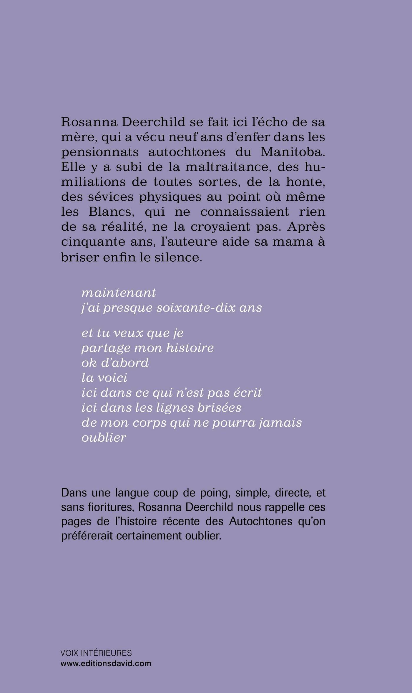 Rosanna Deerchild se fait ici l’écho de sa mère, qui a vécu neuf ans d’enfer dans les pensionnats autochtones du Manitoba. Elle y a subi de la maltraitance, des humiliations de toutes sortes, de la honte, des sévices physiques au point où même les Blancs, qui ne connaissaient rien de sa réalité, ne la croyaient pas. Après cinquante ans, l’auteure aide sa mama à briser enfin le silence.maintenantj’ai presque soixante-dix anset tu veux que jepartage mon histoireok d’abordla voiciici dans ce qui n’est pas écritici dans les lignes briséesde mon corps qui ne pourra jamais oublierDans une langue coup de poing, simple, directe, et sans fioritures, Rosanna Deerchild nous rappelle ces pages de l’histoire récente des Autochtones qu’on préférerait certainement oublier.