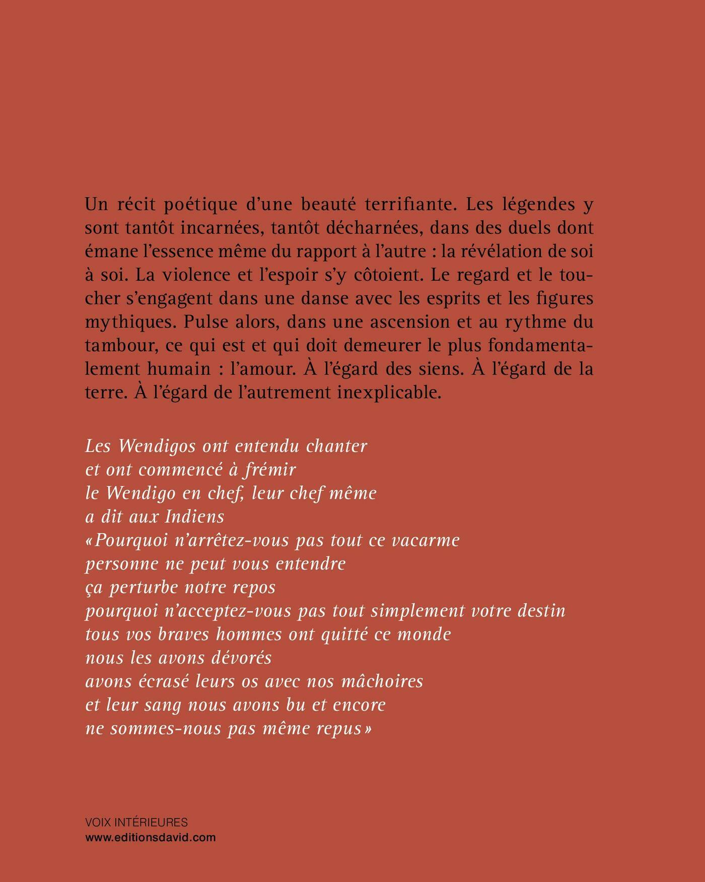 Un récit poétique d'une beauté terrifiante. Les légendes y sont tantôt incarnées, tantôt décharnées, dans des duels dont émane l'essence même du rapport à l'autre : la révélation de soi à soi. La violence et l'espoir s'y côtoient. Le regard et le toucher s'engagent dans une danse avec les esprits et les figures mythiques. Pulse alors, dans une ascension et au rythme du tambour, ce qui est et qui doit demeurer le plus fondamentalement humain : l'amour. À l'égard des siens. À l'égard de la terre. À l'égard de l'autrement inexplicable. Les Wendigos ont entendu chanteret ont commencé à frémirle Wendigo en chef, leur chef mêmea dit aux Indiens« Pourquoi n’arrêtez-vous pas tout ce vacarmepersonne ne peut vous entendreça perturbe notre repospourquoi n’acceptez-vous pas tout simplement votre destintous vos braves hommes ont quitté ce mondenous les avons dévorésavons écrasé leurs os avec nos mâchoireset leur sang nous avons bu et encore ne sommes-nous pas même repus »