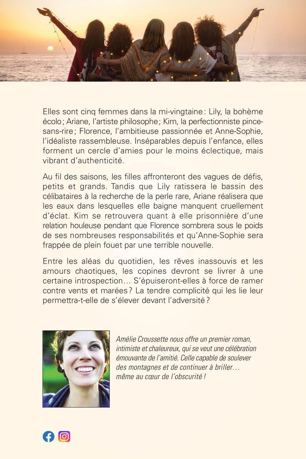 Elles sont cinq femmes dans la mi-vingtaine : Lily, la bohème écolo ; Ariane, l’artiste philosophe ; Kim, la perfectionniste pince-sans-rire ; Florence, l’ambitieuse passionnée et Anne-Sophie, l’idéaliste rassembleuse. Inséparables depuis l’enfance, elles forment un cercle d’amies pour le moins éclectique, mais vibrant d’authenticité.Au fil des saisons, les filles affronteront des vagues de défis, petits et grands. Tandis que Lily ratissera le bassin des célibataires à la recherche de la perle rare, Ariane réalisera que les eaux dans lesquelles elle baigne manquent cruellement d’éclat. Kim se retrouvera quant à elle prisonnière d’une relation houleuse pendant que Florence sombrera sous le poids de ses nombreuses responsabilités et qu’Anne-Sophie sera frappée de plein fouet par une terrible nouvelle.Entre les aléas du quotidien, les rêves inassouvis et les amours chaotiques, les copines devront se livrer à une certaine introspection… S’épuiseront-elles à force de ramer contre vents et marées ? La tendre complicité qui les lie leur permettra-t-elle de s’élever devant l’adversité ?Amélie Croussette nous offre un premier roman, intimiste et chaleureux, qui se veut une célébration émouvante de l’amitié. Celle capable de soulever des montagnes et de continuer à briller… même au cœur de l’obscurité !