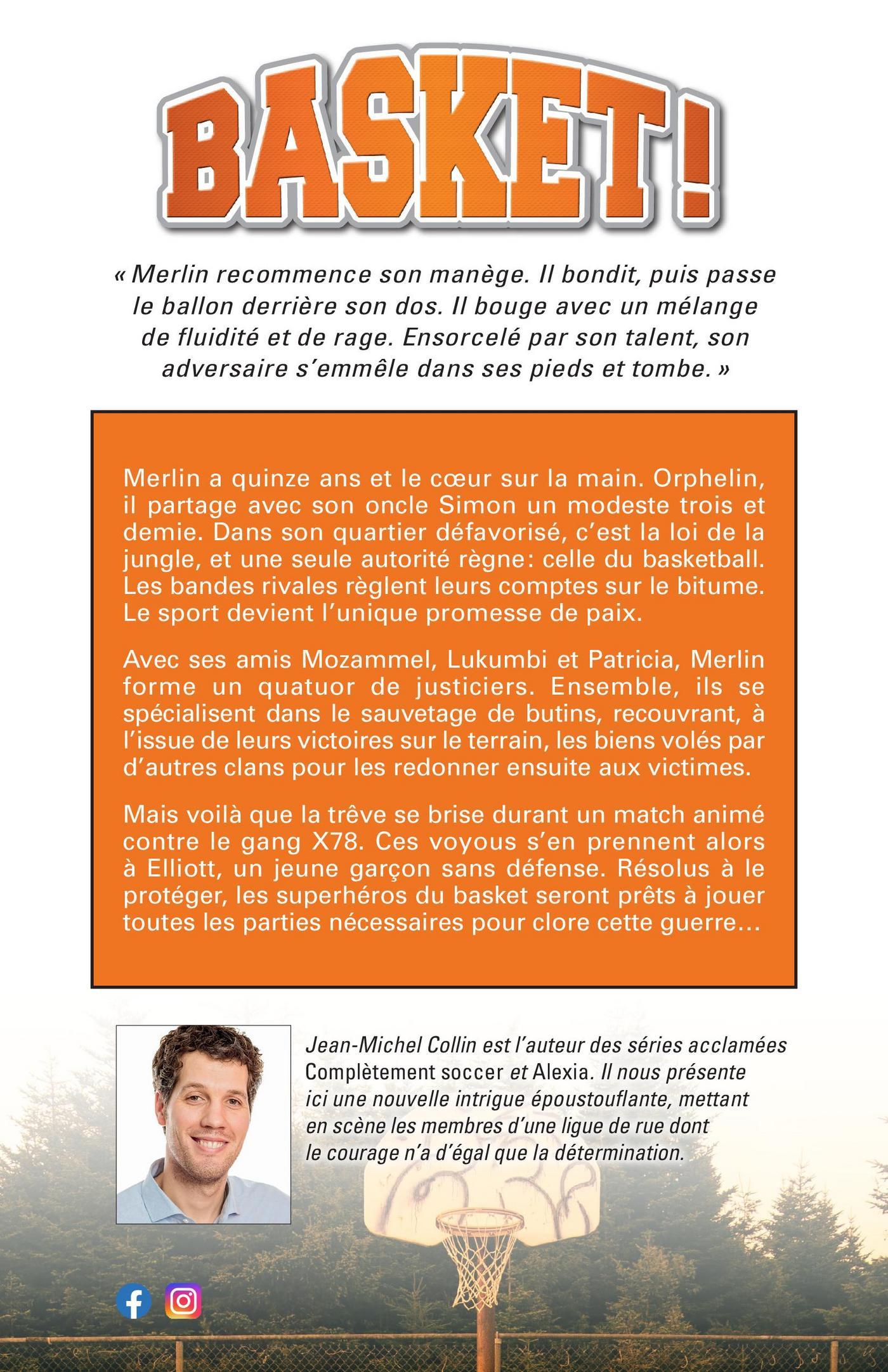 « Merlin recommence son manège. Il bondit, puis passe le ballon derrière son dos. Il bouge avec un mélange de fluidité et de rage. Ensorcelé par son talent, son adversaire s’emmêle dans ses pieds et tombe. »Merlin a quinze ans et le cœur sur la main. Orphelin, il partage avec son oncle Simon un modeste trois et demie. Dans son quartier défavorisé, c’est la loi de la jungle, et une seule autorité règne : celle du basketball. Les bandes rivales règlent leurs comptes sur le bitume. Le sport devient l’unique promesse de paix.Avec ses amis Mozammel, Lukumbi et Patricia, Merlin forme un quatuor de justiciers. Ensemble, ils se spécialisent dans le sauvetage de butins, recouvrant, à l’issue de leurs victoires sur le terrain, les biens volés par d’autres clans pour les redonner ensuite aux victimes.Mais voilà que la trêve se brise durant un match animé contre le gang X78. Ces voyous s’en prennent alors à Elliott, un jeune garçon sans défense. Résolus à le protéger, les superhéros du basket seront prêts à jouer toutes les parties nécessaires pour clore cette guerre… Jean-Michel Collin est l’auteur des séries acclamées Complètement soccer et Alexia. Il nous présente ici une nouvelle intrigue époustouflante, mettant en scène les membres d’une ligue de rue dont le courage n’a d’égal que la détermination.