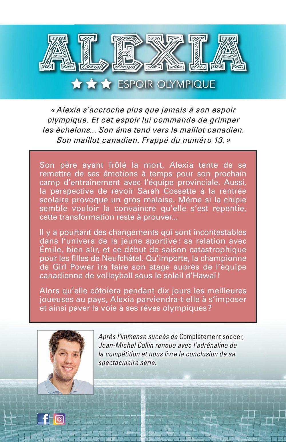 « Alexia s’accroche plus que jamais à son espoir olympique. Et cet espoir lui commande de grimper les échelons... Son âme tend vers le maillot canadien. Son maillot canadien. Frappé du numéro 13. »Son père ayant frôlé la mort, Alexia tente de se remettre de ses émotions à temps pour son prochain camp d’entraînement avec l’équipe provinciale. Aussi, la perspective de revoir Sarah Cossette à la rentrée scolaire provoque un gros malaise. Même si la chipie semble vouloir la convaincre qu’elle s’est repentie, cette transformation reste à prouver...Il y a pourtant des changements qui sont incontestables dans l’univers de la jeune sportive : sa relation avec Émile, bien sûr, et ce début de saison catastrophique pour les filles de Neufchâtel. Qu’importe, la championne de Girl Power ira faire son stage auprès de l’équipe canadienne de volleyball sous le soleil d’Hawaï !Alors qu’elle côtoiera pendant dix jours les meilleures joueuses au pays, Alexia parviendra-t-elle à s’imposer et ainsi paver la voie à ses rêves olympiques ?Après l’immense succès de Complètement soccer, Jean-Michel Collin renoue avec l’adrénaline de la compétition et nous livre la conclusion de sa spectaculaire série.