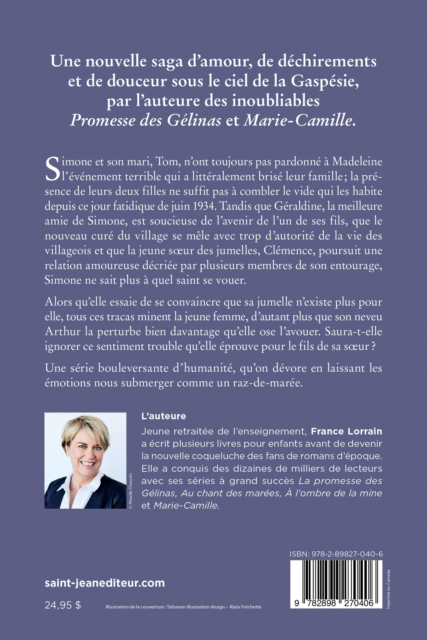 Une nouvelle saga d’amour, de déchirements et de douceur sous le ciel de la Gaspésie, par l’auteure des inoubliables Promesse des Gélinas et Marie-Camille. Simone et son mari Tom n’ont toujours pas pardonné à Madeleine l’événement terrible qui a littéralement brisé leur famille; la présence de leurs deux filles ne suffit plus à combler le vide qui les habite depuis ce jour fatidique de juin 1934. Tandis que Géraldine, la meilleure amie de Simone, est soucieuse de l’avenir de l’un de ses fils, que le nouveau curé du village se mêle avec trop d’autorité de la vie des villageois et que la jeune sœur des jumelles, Clémence, poursuit une relation amoureuse décriée par plusieurs membres de son entourage, Simone ne sait plus à quel saint se vouer. Même si elle essaie de se convaincre que sa jumelle n’existe plus pour elle, tous ces tracas minent la jeune femme, d’autant plus que son neveu Arthur la perturbe bien davantage qu’elle ose l’avouer. Saura-t-elle ignorer ce sentiment trouble qu’elle éprouve pour le fils de sa sœur? Une série bouleversante d’humanité, qu’on dévore en laissant les émotions nous submerger comme un raz-de-marée.