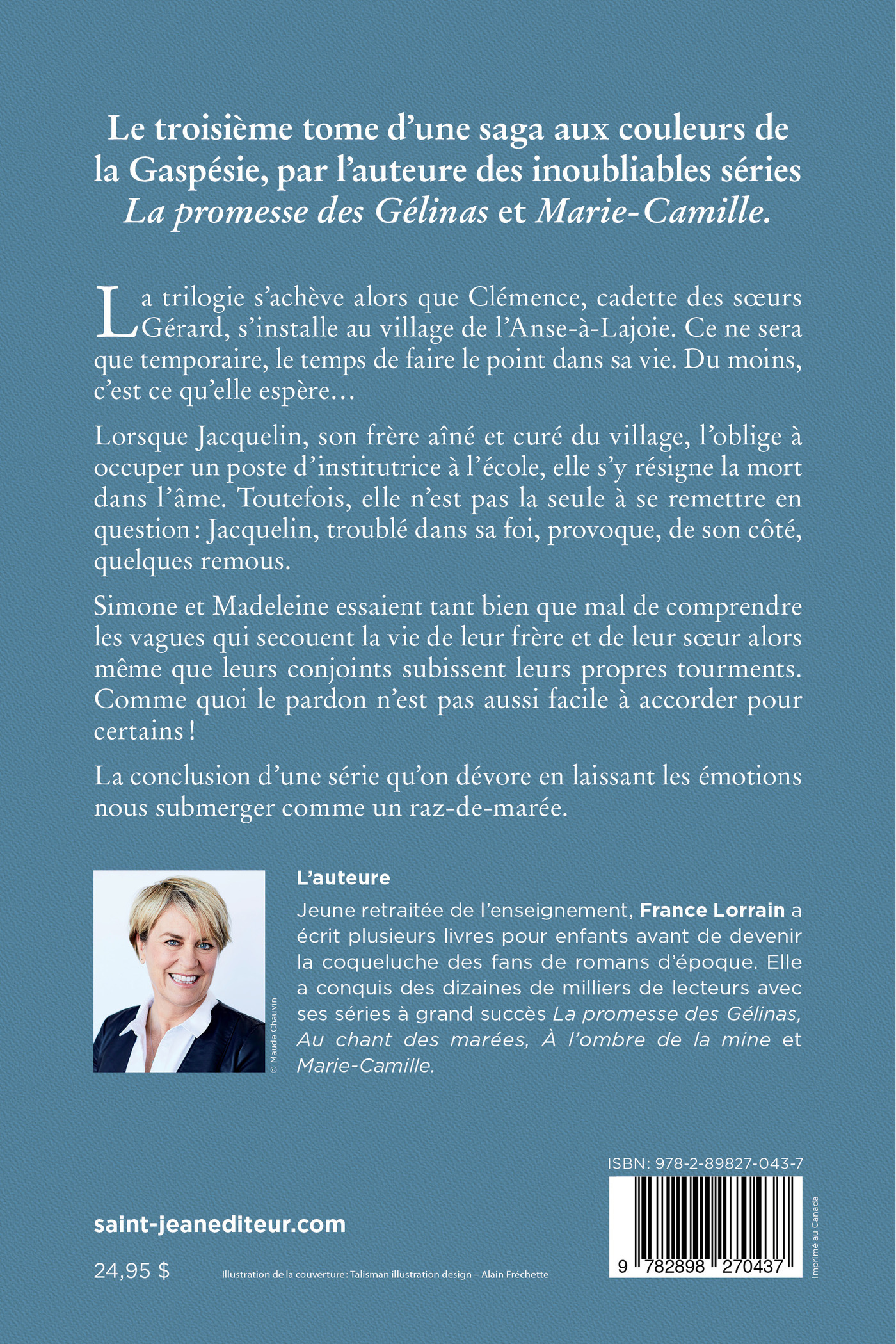 Le troisième tome d’une saga aux couleurs de la Gaspésie, par l’auteure des inoubliables séries La promesse des Gélinas et Marie-CamilleLa trilogie s’achève alors que Clémence, cadette des sœurs Gérard, s’installe au village de l’Anse-à-Lajoie. Ce ne sera que temporaire, le temps de faire le point dans sa vie. Du moins, c’est ce qu’elle espère…Lorsque Jacquelin, son frère aîné et curé du village, l’oblige à occuper un poste d’institutrice à l’école, elle s’y résigne la mort dans l’âme. Toutefois, elle n’est pas la seule à se remettre en question: Jacquelin, troublé dans sa foi, provoque, de son côté, quelques remous.Simone et Madeleine essaient tant bien que mal de comprendre les vagues qui secouent la vie de leur frère et de leur sœur alors même que leurs conjoints subissent leurs propres tourments. Comme quoi le pardon n’est pas aussi facile à accorder pour certains!La conclusion d’une série qu’on dévore en laissant les émotions nous submerger comme un raz-de-marée.
