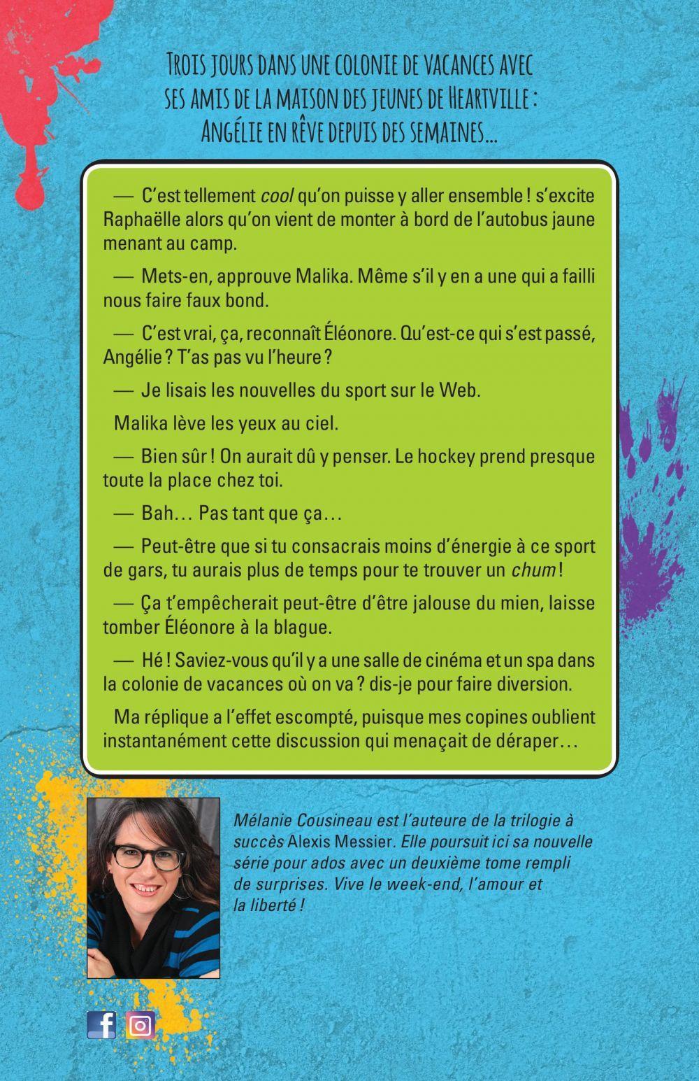 Trois jours dans une colonie de vacances avec ses amis de la maison des jeunes de Heartville : Angélie en rêve depuis des semaines…— C’est tellement cool qu’on puisse y aller ensemble ! s’excite Raphaëlle alors qu’on vient de monter à bord de l’autobus jaune menant au camp.— Mets-en, approuve Malika. Même s’il y en a une qui a failli nous faire faux bond.— C’est vrai, ça, reconnaît Éléonore. Qu’est-ce qui s’est passé, Angélie ? T’as pas vu l’heure ?— Je lisais les nouvelles du sport sur le Web. Malika lève les yeux au ciel.— Bien sûr ! On aurait dû y penser. Le hockey prend presque toute la place chez toi.— Bah… Pas tant que ça…— Peut-être que si tu consacrais moins d’énergie à ce sport de gars, tu aurais plus de temps pour te trouver un chum !— Ça t’empêcherait peut-être d’être jalouse du mien, laisse tomber Éléonore à la blague.— Hé ! Saviez-vous qu’il y a une salle de cinéma et un spa dans la colonie de vacances où on va ? dis-je pour faire diversion.Ma réplique a l’effet escompté, puisque mes copines oublient instantanément cette discussion qui menaçait de déraper…Mélanie Cousineau est l’auteure de la trilogie à succès Alexis Messier. Elle poursuit ici sa nouvelle série pour ados avec un deuxième tome rempli de surprises. Vive le week-end, l’amour et la liberté !