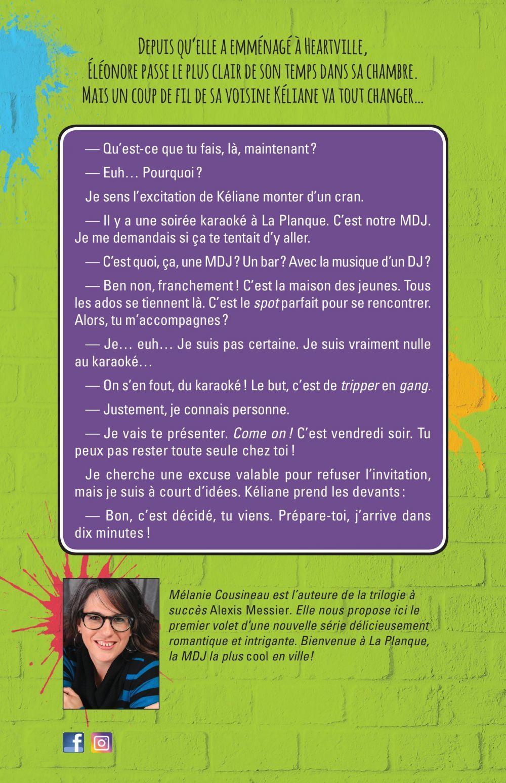 Depuis qu’elle a emménagé à Heartville, Éléonore passe le plus clair de son temps dans sa chambre. Mais un coup de fil de sa voisine Kéliane va tout changer…— Qu’est-ce que tu fais, là, maintenant ?— Euh… Pourquoi ?Je sens l’excitation de Kéliane monter d’un cran.— Il y a une soirée karaoké à La Planque. C’est notre MDJ. Je me demandais si ça te tentait d’y aller.— C’est quoi, ça, une MDJ ? Un bar ? Avec la musique d’un DJ ?— Ben non, franchement ! C’est la maison des jeunes. Tous les ados se tiennent là. C’est le spot parfait pour se rencontrer. Alors, tu m’accompagnes ?— Je… euh… Je suis pas certaine. Je suis vraiment nulle au karaoké…— On s’en fout, du karaoké ! Le but, c’est de tripper en gang.— Justement, je connais personne.— Je vais te présenter. Come on ! C’est vendredi soir. Tu peux pas rester toute seule chez toi ! Je cherche une excuse valable pour refuser l’invitation, mais je suis à court d’idées. Kéliane prend les devants :— Bon, c’est décidé, tu viens. Prépare-toi, j’arrive dans dix minutes !Mélanie Cousineau est l’auteure de la trilogie à succès Alexis Messier. Elle nous propose ici le premier volet d’une nouvelle série délicieusement romantique et intrigante. Bienvenue à La Planque, la MDJ la plus cool en ville !