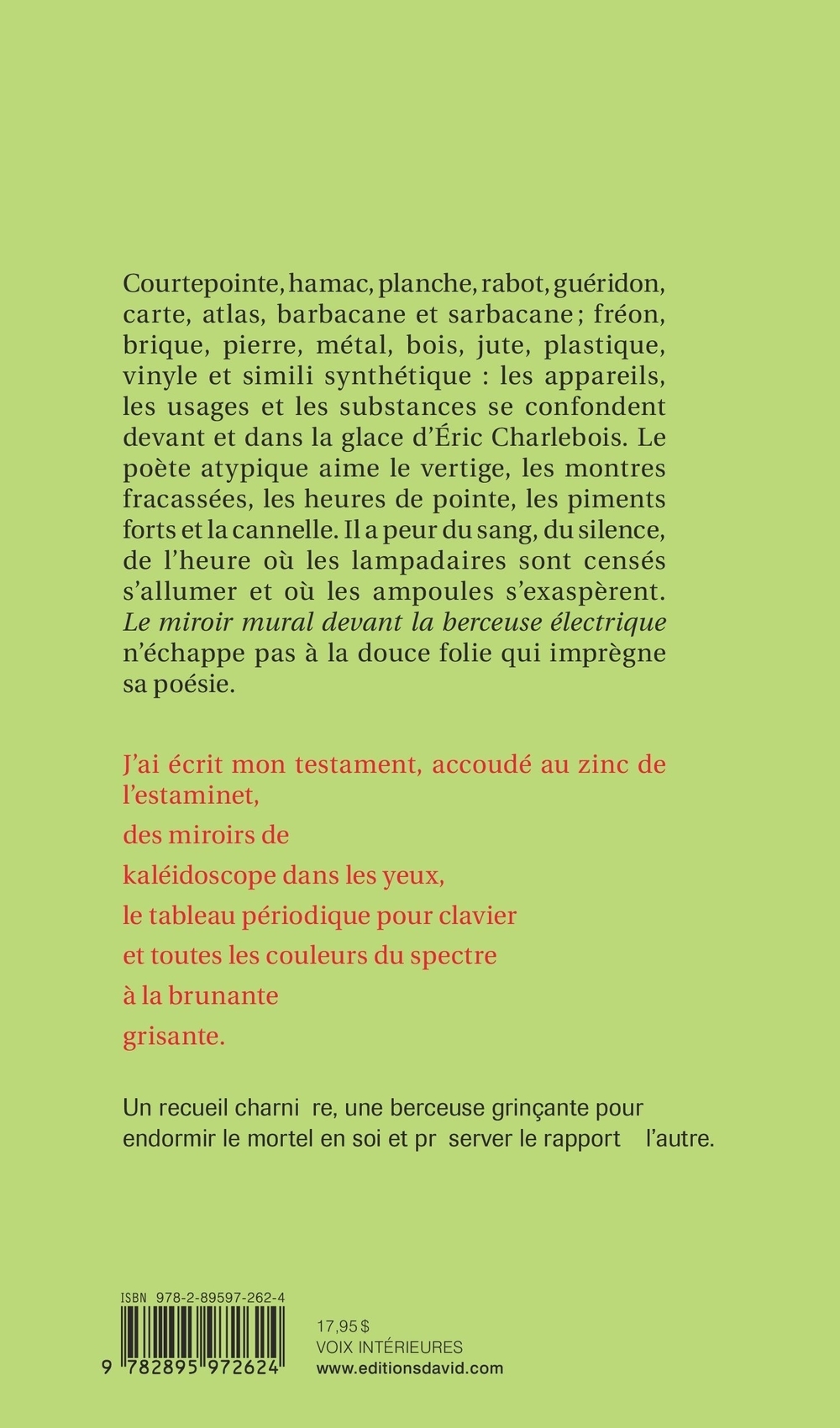 Courtepointe, hamac, planche, rabot, guéridon, carte, atlas, barbacane et sarbacane; fréon, brique, pierre, métal, bois, jute, plastique, vinyle et simili synthétique : les appareils, les usages et les substances se confondent devant et dans la glace d’Éric Charlebois. Le poète atypique aime le vertige, les montres fracassées, les heures de pointe, les piments forts et la cannelle. Il a peur du sang, du silence, de l’heure où les lampadaires sont censés s’allumer et où les ampoules s’exaspèrent. Le miroir mural devant la berceuse électrique n’échappe pas à la douce folie qui imprègne sa poésie. J’ai écrit mon testament, accoudé au zinc de l’estaminet,des miroirs de kaléidoscope dans les yeux,le tableau périodique pour clavieret toutes les couleurs du spectreà la brunantegrisante.Un recueil charnière, une berceuse grinçante pour endormir le mortel en soi et préserver le rapport à l’autre.