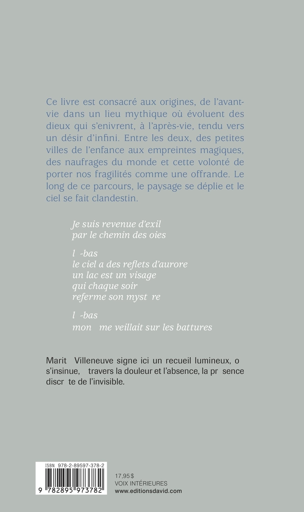 Ce livre est consacré aux origines, de l’avant-vie dans un lieu mythique où évoluent des dieux qui s’enivrent, à l’après-vie, tendu vers un désir d’infini. Entre les deux, des petites villes de l’enfance aux empreintes magiques, des naufrages du monde et cette volonté de porter nos fragilités comme une offrande. Le long de ce parcours, le paysage se déplie et le ciel se fait clandestin.Je suis revenue d’exilpar le chemin des oieslà-bas le ciel a des reflets d’auroreun lac est un visagequi chaque soirreferme son mystèrelà-bas mon âme veillait sur les batturesMarité Villeneuve signe ici un recueil lumineux, où s’insinue, à travers la douleur et l’absence, la présence discrète de l’invisible.