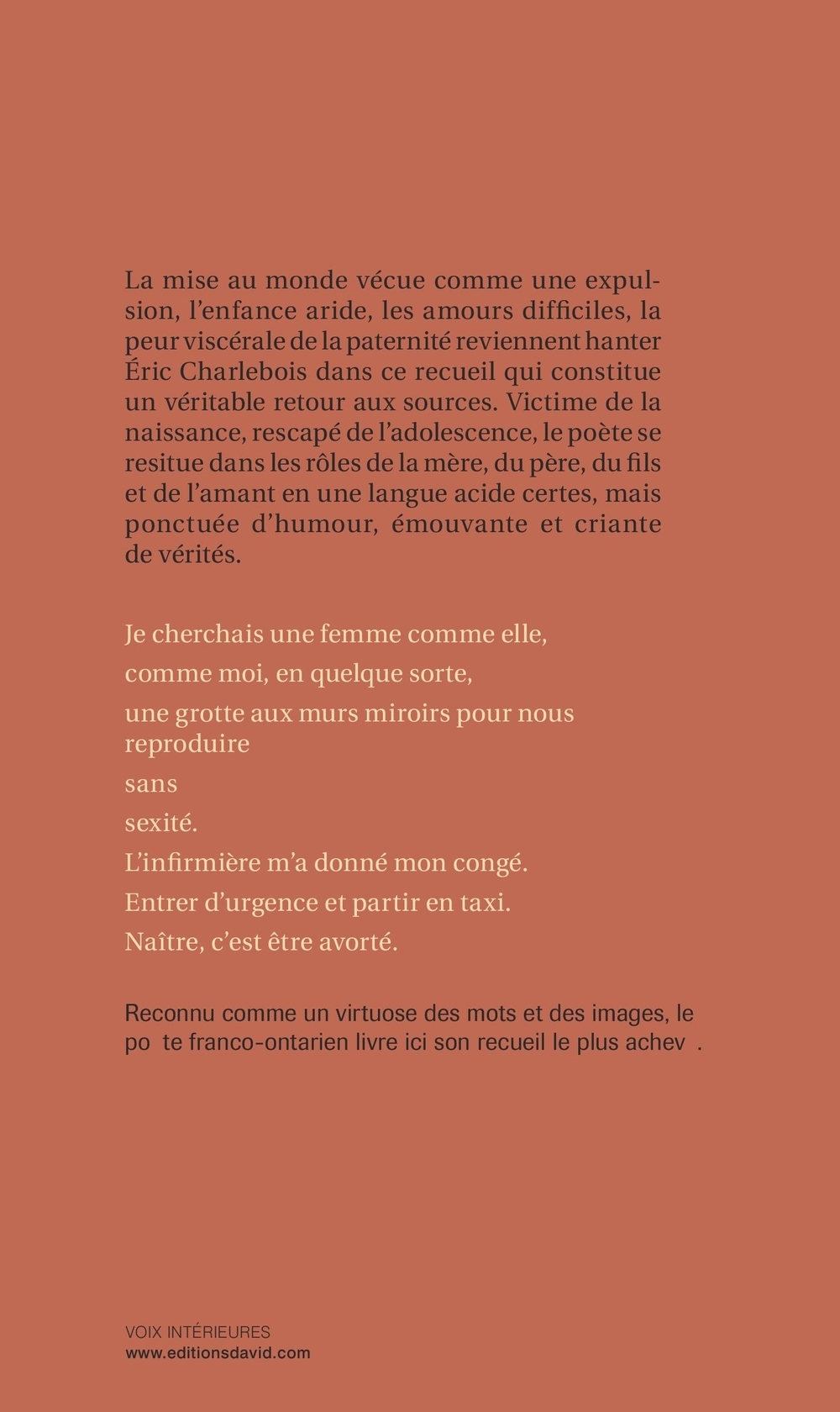 La mise au monde vécue comme une expulsion, l’enfance aride, les amours difficiles, la peur viscérale de la paternité reviennent hanter Éric Charlebois dans ce recueil qui constitue un véritable retour aux sources. Victime de la naissance, rescapé de l’adolescence, le poète se resitue dans les rôles de la mère, du père, du fils et de l’amant en une langue acide certes, mais ponctuée d’humour, émouvante et criante de vérités.Je cherchais une femme comme elle,comme moi, en quelque sorte, une grotte aux murs miroirs pour nous reproduiresans sexité.L’infirmière m’a donné mon congé.Entrer d’urgence et partir en taxi.Naître, c’est être avorté.Reconnu comme un virtuose des mots et des images, le poète franco-ontarien livre ici son recueil le plus achevé.