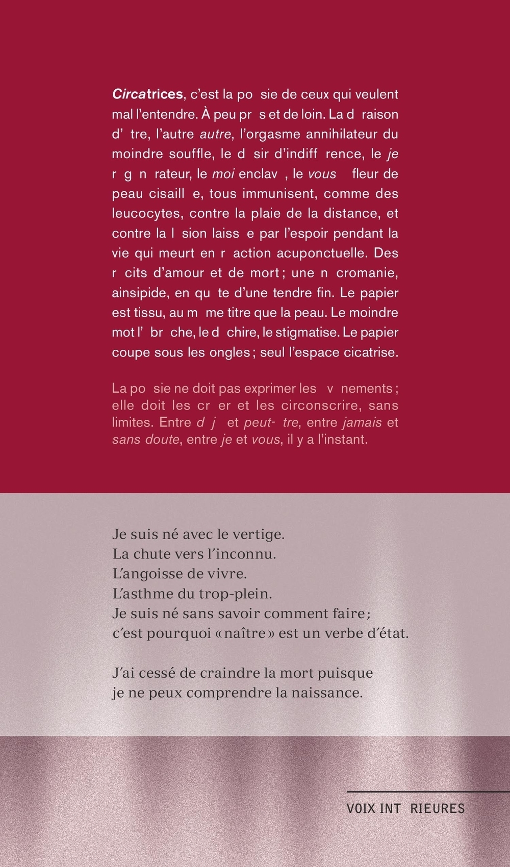 Circatrices, c’est la poésie de ceux qui veulent mal l’entendre. À peu près et de loin. La déraison d’être, l’autre «autre», l’orgasme annihilateur du moindre souffle, le désir d’indifférence, le «je» régénérateur, le «moi» enclavé, le «vous» à fleur de peau cisaillée, tous immunisent, comme des leucocytes, contre la plaie de la distance, et contre la lésion laissée par l’espoir pendant la vie qui meurt en réaction acuponctuelle. Des récits d’amour et de mort ; une nécromanie, ainsipide, en quête d’une tendre fin. Le papier est tissu, au même titre que la peau. Le moindre mot l’ébrèche, le déchire, le stigmatise. Le papier coupe sous les ongles ; seul l’espace cicatrise.Je suis né avec le vertige.La chute vers l’inconnu.L’angoisse de vivre.L’asthme du trop-plein.Je suis né sans savoir comment faire ;c’est pourquoi « naître » est un verbe d’état.J’ai cessé de craindre la mort puisque je ne peux comprendre la naissance.La poésie ne doit pas exprimer les événements ; elle doit les créer et les circonscrire, sans limites. Entre «déjà» et «peut-être», entre «jamais» et «sans doute», entre «je» et «vous», il y a l’instant.