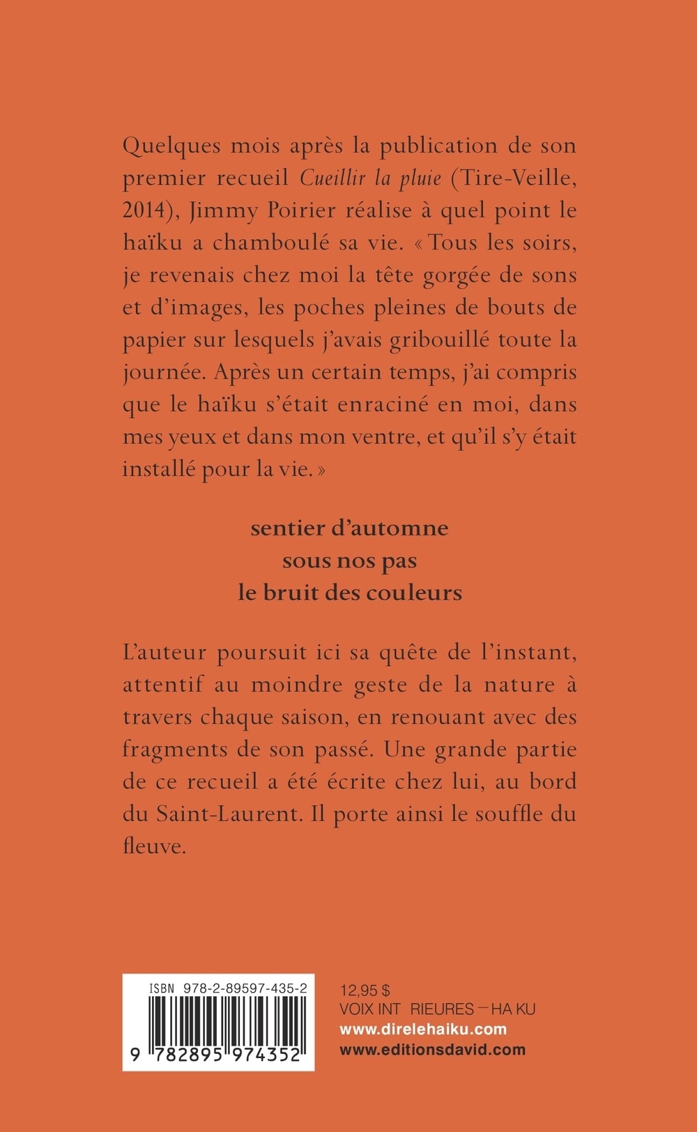 Quelques mois après la publication de son premier recueil «Cueillir la pluie» (Tire-Veille, 2014), Jimmy Poirier réalise à quel point le haïku a chamboulé sa vie. Tout doucement, presque imperceptiblement, une agréable lenteur s'est installée dans son quotidien. « Tous les soirs, je revenais chez moi la tête gorgée de sons et d'images, les poches pleines de bouts de papier sur lesquels j'avais gribouillé toute la journée. Après un certain temps, j'ai compris que le haïku s'était enraciné en moi, dans mes yeux et dans mon ventre, et qu'il s'y était installé pour la vie. »sentier d'automne / sous nos pas / le bruit des couleursL’auteur poursuit ici sa quête de l’instant, attentif au moindre geste de la nature à travers chaque saison, en renouant avec des fragments de son passé. Une grande partie de ce recueil a été écrite chez lui, au bord du Saint-Laurent. Habiter ce lieu inspirant, c'est porter en soi le souffle du fleuve.