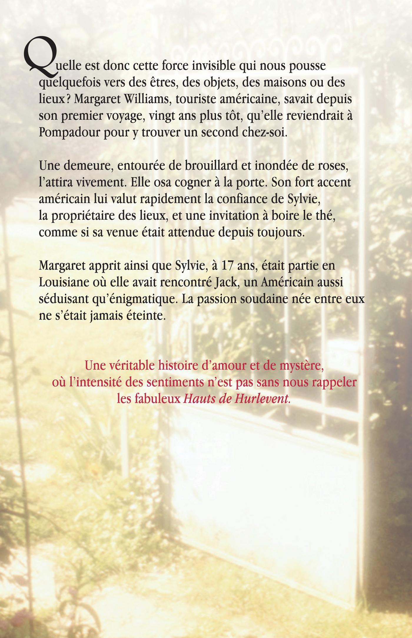 Lors d’un séjour à Pompadour, un apparent hasard conduit Margaret Williams devant une propriété plongée dans le brouillard et croulant sous les roses.Malgré elle, comme poussée par une force surnaturelle, elle ose frapper à la porte. Une belle femme d’âge mûr lui ouvre. Sylvie est pâle, semble fatiguée et vulnérable, mais elle arbore un sourire avenant. Charmée par le fort accent de la visiteuse, elle l’invite spontanément à prendre le thé.Comme si elle avait attendu Margaret depuis toujours, elle se met alors à lui raconter que jadis, à 17 ans, elle est partie en Louisiane et y a rencontré Jack, un homme marié aussi séduisant qu’énigmatique. Une étincelle a jailli et ne s’est jamais éteinte. Depuis ce jour, cet amour reste pour Sylvie un grand bonheur qu’elle continue quotidiennement de goûter avec délectation.Au fil du récit, entre les murs de cette charmante villa à l’atmosphère étrange, Margaret sent que tout n’est pas comme veut bien le laisser croire son hôtesse. Un mystère plane, tous les morceaux ne collent pas.Intriguée, fascinée, l’Américaine accepte l’invitation de Sylvie, qui se sent bien seule en l’absence de son Jack occupé par ses affaires, de venir la trouver chaque jour et de bavarder avec elle. Mais que se cache-t-il donc derrière ce visage joli et fragile?