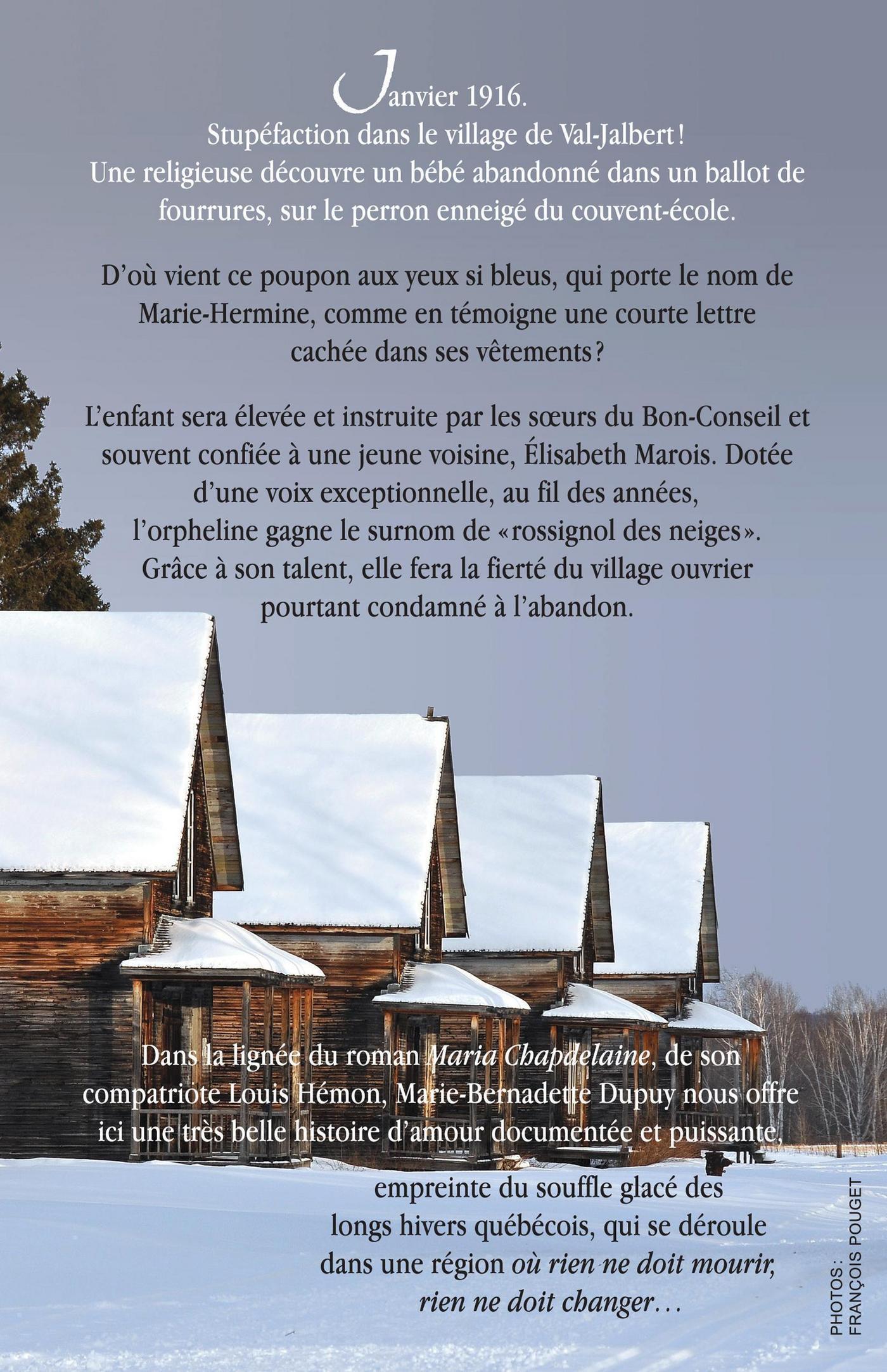 Un soir glacé de l'Épiphanie 1916, dans le village de Val-Jalbert, au Lac-Saint-Jean, une des religieuses du couvent-école découvre un bébé d'un an, niché dans un ballot de fourrures. Les sœurs de Notre-Dame-du-Bon-Conseil viennent alors tout juste de prendre leur fonction d'enseignante, et celles-ci sont bien désemparées devant la fillette abandonnée, peut-être atteinte de la redoutable picote. Val-Jalbert, bourgade ouvrière édifiée au pied de la chute de la rivière Ouiatchouan, abrite une population vaillante où rien ne manque. Gérée par la compagnie qui fabrique de la pâte de bois pour le marché mondial, la vie s'y écoule dans l'ordre et une moralité irréprochable. L'enfant de la nuit bouleversera peu à peu l'existence des sœurs et de leurs voisins immédiats, les membres de la famille Marois, qui la prendront en charge. Mais d'où vient Marie-Hermine, aux yeux si bleus? Pourquoi ses parents l'ont-elle déposée comme un fardeau encombrant à la porte du couvent-école? Dotée d'une voix exceptionnelle, au fil des années, l'orpheline deviendra celle que l'on appellera affectueusement « le rossignol des neiges », l'orgueil du village ouvrier pourtant condamné à l'abandon à cause de la fermeture de l'usine en 1927. À cette occasion, les maisons se vident, les jardins sont abandonnés et les religieuses quittent le village, qui devient quasiment désert. Or, au cours de ces événements fortuits, le passé de Marie-Hermine refera surface, les jalousies écloront, comme l'amour d'un jeune métis, Toshan, rencontré lors d'un passage au bord du lac Saint-Jean.