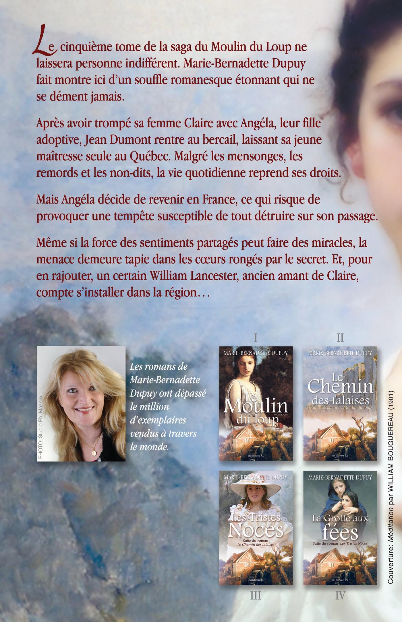 Charente, 1925. La foudre vient de frapper les étendoirs du Moulin du loup, causant un violent incendie qui ravage une partie importante des bâtiments industriels. Bénissant le ciel d'avoir au moins épargné la maison ancestrale, ce foyer qu'elle chérit tendrement, Claire attend avec impatience le retour de Jean, parti au Canada avec leur fille adoptive, Angéla. Ainsi, l'épreuve sera moins pénible à supporter. Mais dès son arrivée, la fille de Colin Roy constate que son mari a changé, montre des comportements étranges. Distant et taciturne, malgré tous les vaillants efforts qu'il investit dans les travaux de réfection, l'homme semble traîner un lourd secret qu'elle ne peut percer. Or, quand Angéla revient dans la vallée des eaux-claires, enceinte de surcroit, une tempête effroyable brise les cœurs et les âmes. Devant toute la famille réunie, la jeune fille clame alors qu'elle aime son père adoptif et prétend qu'il l'aime, lui aussi. Trahie et humiliée, surtout car elle-même n'a jamais pu avoir d'enfant, Claire chasse les deux amants du moulin. Démolie au plus profond de son âme, la guérisseuse devra surmonter cette terrible blessure et reprendre ses activités. Oui, elle doit se battre, renaître et reprendre une vie normale! Mais trouvera-t-elle la force de pardonner à l'ancien bagnard, qui de son côté, exilé d'abord chez sa soeur puis dans le sud de la France, est malade de honte et de chagrin ?Le chemin de la rédemption sera effectivement long et difficile, autant pour Jean que pour Angéla, réfugiée chez Bertille, la cousine de Claire. Et au bout de plusieurs mois de bouderie, de retrouvailles, de malentendus, de fuites, de crises de jalousie, de disputes et de courts et rares moments de bonheur, l'avenir brillera enfin et offrira au couple réconcilié la plus belle des récompenses...