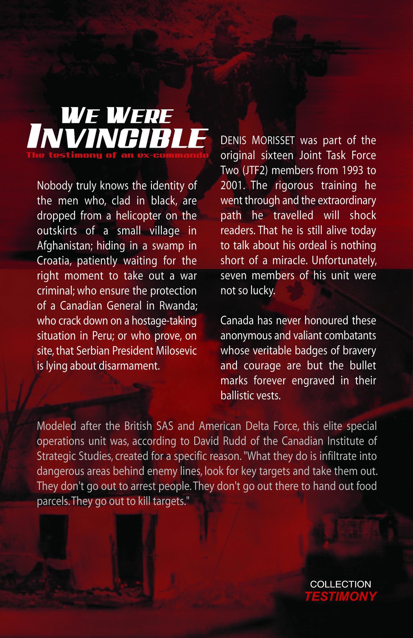 Nobody really knows who these men are- men in black dropped off by a helicopter on the outskirts of a small Afghan village; wading through swamps in Croatia, intent on killing a war criminal; who ensure the protection of a Canadian General in Rwanda; who subdue hostage takers in Peru; and who prove, on-site, the Serbian disarmament lies told by President Milosevic. DENIS MORISSET was part of the initial sixteen-member Joint Task Force 2 (JTF 2) unit from 1993-2001. His extensive and rigorous training and hardships will make more than one reader realize that his being alive today is nothing short of a miracle. Seven members of his unit have not lived to tell the tale. Canada, for good reason, will never render justice to these anonymous combatants whose only medals of bravery are the numerous scars still visible on their bullet-proof vests. Unlike the British SAS and the United States’ Delta Force, this special Canadian intervention unit was, according to David Rudd of the Canadian Institute of Strategic Studies, trained “to infiltrate into dangerous areas behind enemy lines, look for key targets and take them out. They don't go out to arrest people. They don't go out there to hand out food parcels. They go out to kill targets.”