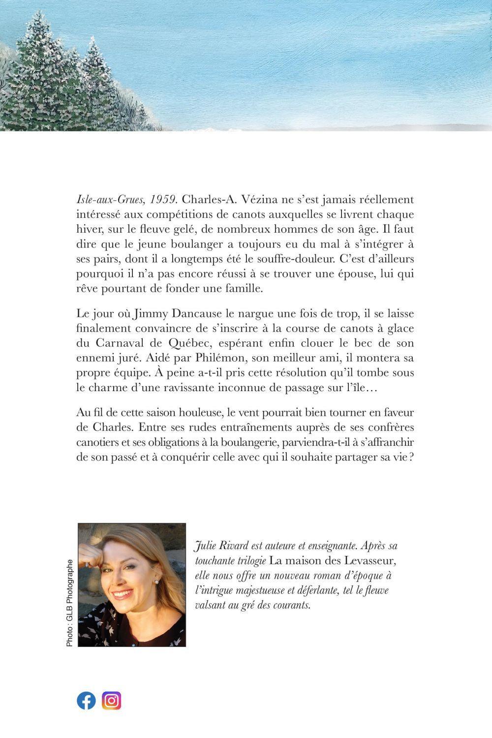 Isle-aux-Grues, 1959. Charles-A. Vézina ne s’est jamais réellement intéressé aux compétitions de canots auxquelles se livrent chaque hiver, sur le fleuve gelé, de nombreux hommes de son âge. Il faut dire que le jeune boulanger a toujours eu du mal à s’intégrer à ses pairs, dont il a longtemps été le souffre-douleur. C’est d’ailleurs pourquoi il n’a pas encore réussi à se trouver une épouse, lui qui rêve pourtant de fonder une famille.Le jour où Jimmy Dancause le nargue une fois de trop, il se laisse finalement convaincre de s’inscrire à la course de canots à glace du Carnaval de Québec, espérant enfin clouer le bec de son ennemi juré. Aidé par Philémon, son meilleur ami, il montera sa propre équipe. À peine a-t-il pris cette résolution qu’il tombe sous le charme d’une ravissante inconnue de passage sur l’île…Au fil de cette saison houleuse, le vent pourrait bien tourner en faveur de Charles. Entre ses rudes entraînements auprès de ses confrères canotiers et ses obligations à la boulangerie, parviendra-t-il à s’affranchir de son passé et à conquérir celle avec qui il souhaite partager sa vie ?Julie Rivard est auteure et enseignante. Après sa touchante trilogie La maison des Levasseur, elle nous offre un nouveau roman d’époque à l’intrigue majestueuse et déferlante, tel le fleuve valsant au gré des courants.